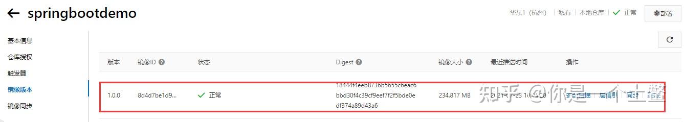 docker push registry.cn-hangzhou.aliyuncs.com/test_respository/springbootdemo:1.0.0此时点击镜像版本查看一下镜像能否胜利上传了: