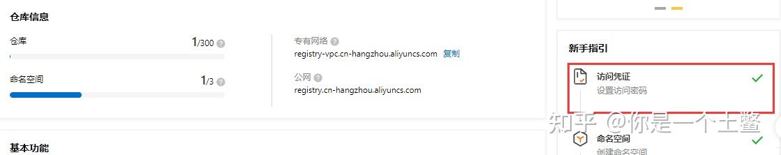 docker login --username=取个名字好困难a registry.cn-hangzhou.aliyuncs.com然后会要求输入密码,密码在开通容器镜像办事的时候就会让你设置,若是没有设置密码,也能够在页面右侧的新手引导中点击拜候凭证停止设置: