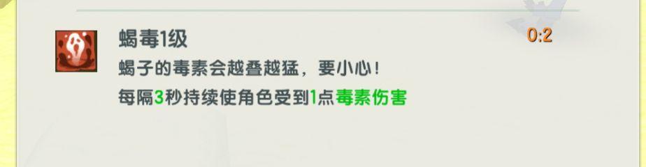 毒尾蝎主动攻击,每攻击2次会形成蝎毒效果,蝎毒会持续叠加,更高可叠加至3级,每级增加1点毒素危险。蝎毒形态持续6秒。