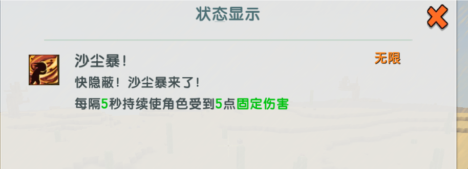 沙原领主戈壁boss呈现后,全数戈壁地形会呈现沙尘暴,不管多高,只要在戈壁地形城S有沙尘暴(戈壁绿洲没有沙尘暴)。沙尘暴有阻力,会使你往后倒退。每隔5秒就会掉血。