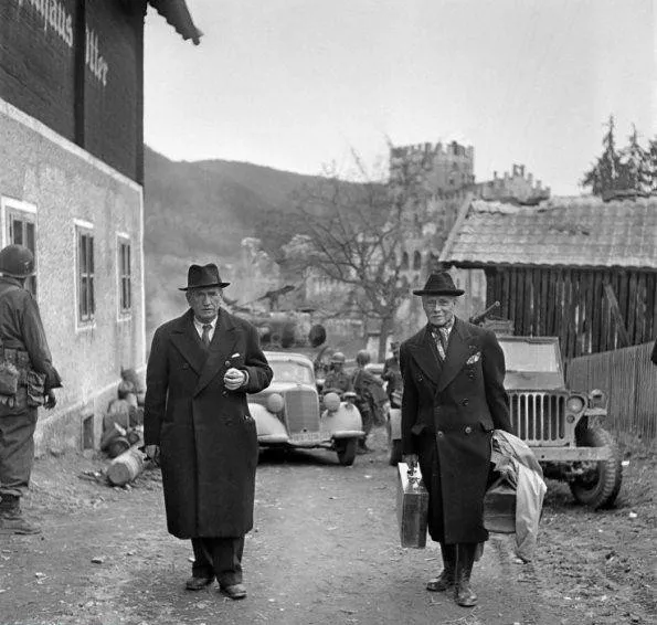 图为1945年5月5日,活着走出伊特堡的法国前总理达拉第(左)和前法军总司令甘末林将军(右) 博洛特拉一心想第一个回到城堡,但不巧的是,那份荣誉没能属于他,还有另一收美军队伍没有先过河,而是先沿着河西边南下,清理残敌,然后再渡河之后北上伊特村,他们很快就肃清了村子内的残敌。
