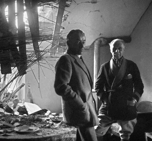 战斗事后,末林将军(右)在伊特堡被党卫军炮弹损毁的房间内合影就在此时,在外面的珍妮也被一枚反坦克炮炮弹击中,所幸在车里车外的三人无人受伤,院子里的法国政要们闻听此讯不由大惊失色,很多人又赶紧躲到了阴冷湿润的地下室,短短几分钟之内,院子里就只剩下了四个法国人。