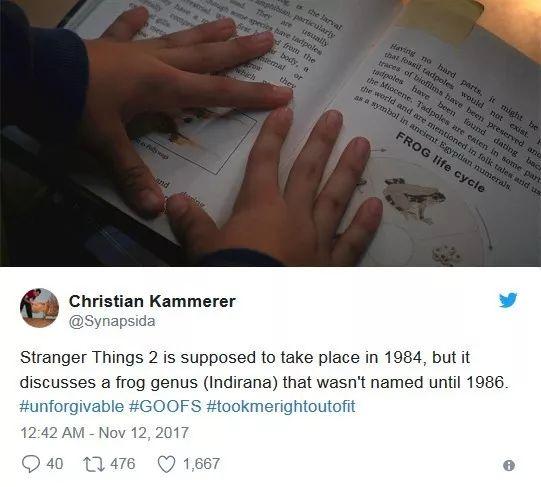 【35】22:16 达斯汀指出了生物书上的两种陆生蝌蚪:印度棕跳蛙/Indirana semipalmat和南美细趾蟾蜍/Adenomera andreae,那两点没错。不外北卡罗来纳州天然科学博物馆的古生物学馆长克里斯蒂安·坎莫尔在推特上指出:“《怪物物语2》的故事设定在1984年,但男孩谈到的那种青蛙物种(印度棕跳蛙)不断到1986年才被定名。”其实第二季第一集也有一个类似的小错误。南茜和史蒂夫去芭芭拉家吃饭,史蒂夫说:“我爱KFC”。在九十年代之前,KFC还没有正式改名为首字母缩写,人们不断都叫它“Kentucky”。