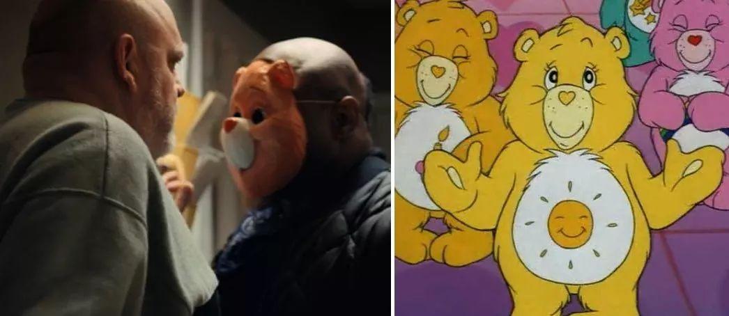 【72】28:14 大熊的面具是“阳光宝物熊/Funshine Bear”,出自《爱心熊宝宝》等一系列八十年代动画片子。