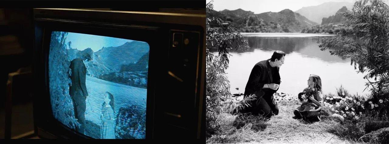 【26】36:54 懊恼的El单独在家看电视,屏幕里是全球1931版《弗兰肯斯坦》中最令人心酸的那段情节:弗兰肯斯坦和女孩往湖里丢花瓣(El是不是在思虑本身是他俩中的哪一个?)。伟大的玛丽·雪莱,伟大的詹姆士·威尔!