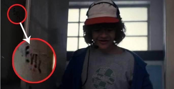 【39】46:02 小怪兽达达逃跑到茅厕,达斯汀在最初一个侧坑找到了它。门上的涂鸦“Evil”,预示着它即将蜕酿成不再心爱的怪物。