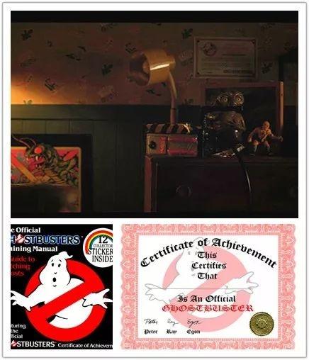 【34】02:49 达斯汀的房间是一个充满八十年代流行文化符号的宝库(第一季的暗影谷和第二季的夺心魔都出自他口)。桌子上能够看到一个大号E.T.手办,和《龙与地下城》中的食人魔/Odious Ogre玩具。房间墙上还能够看到一张“捉鬼敢死队证书”。它来自于一本《捉鬼敢死队官方训练手册:捉鬼指南》儿童书,里面有各类与片子有关的道具解析和贴画式问答题。完成所有使命后,能够看到最初一页的“捉鬼证书”,上面印有三位配角们的签名。是的,没有温斯顿。