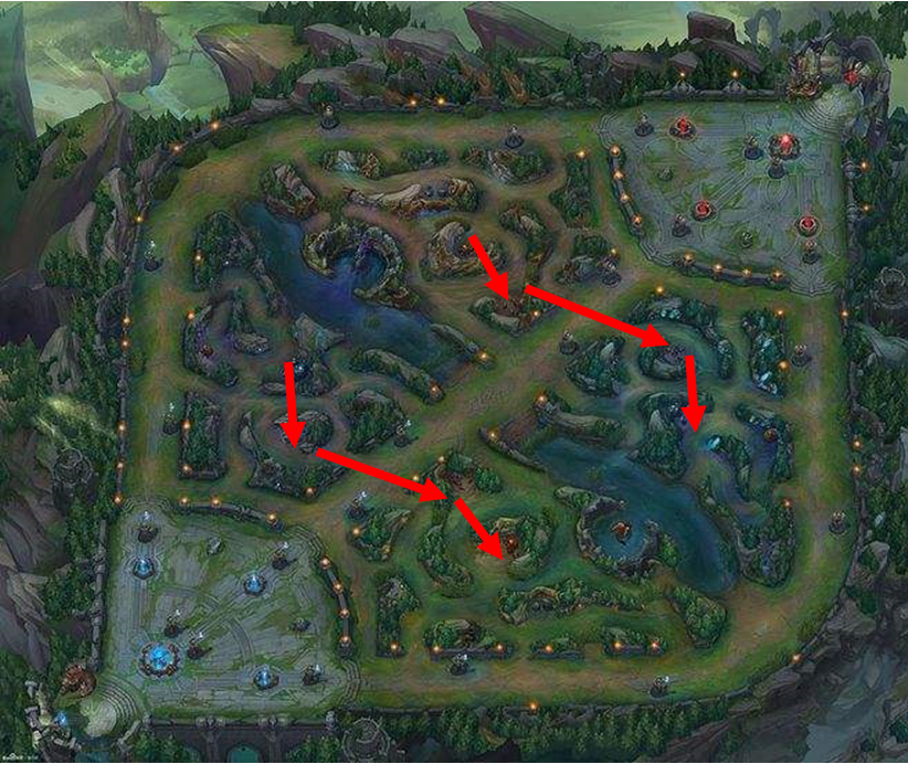 如图所示,蓝色方:红开,石头,F6,三狼,蓝BUFF,魔沼蛙,再按照场面地步选择是打河蟹仍是GANK。红色方:蓝开,魔沼蛙,三狼,F6,红,石头人。然后GANK或者打河蟹,在打河蟹时留意用W的眩晕削减河蟹的双抗。那条道路凸起一个发育,也是职业赛场最常用道路,间接刷到4级,最为不变,但要留意的是在刷野时留意本身的站位和视野布控放置敌方入侵。