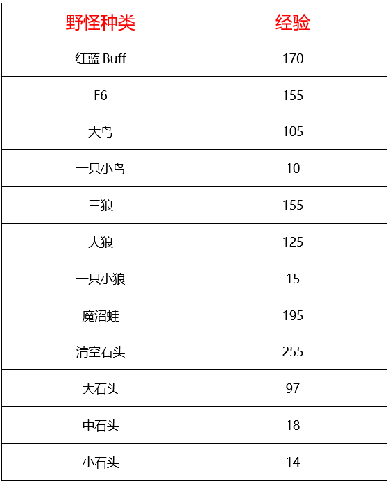 附上联盟哥野怪经历值和英雄晋级所需经历值表: