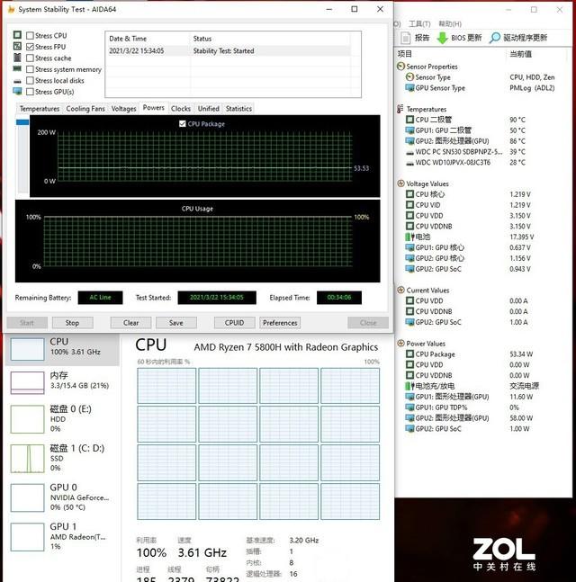 压力测试34分钟,锐龙7 5800H连结全核心3.6GHz,功耗不变在53W,核心温度连结在90°。从成果来看,锐龙7 5800H的性能释放连结在了比力不错的程度。