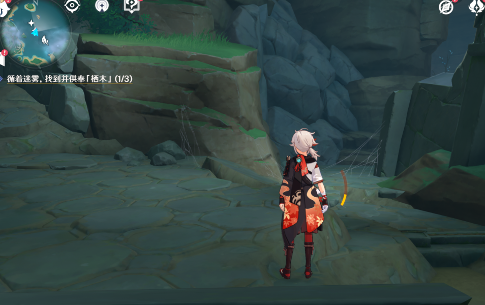 做完栖木①后往北,来到知比山周边,在图中所示,往知比山右侧走,我们能够看到一个仙灵所在的洞口。