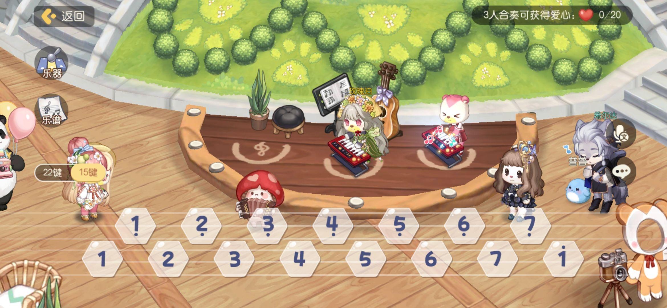 三人合奏能够获得20爱心,不建议每天都弄,浪费时间且回报低。