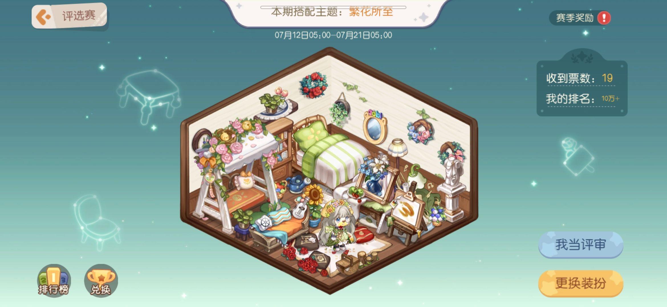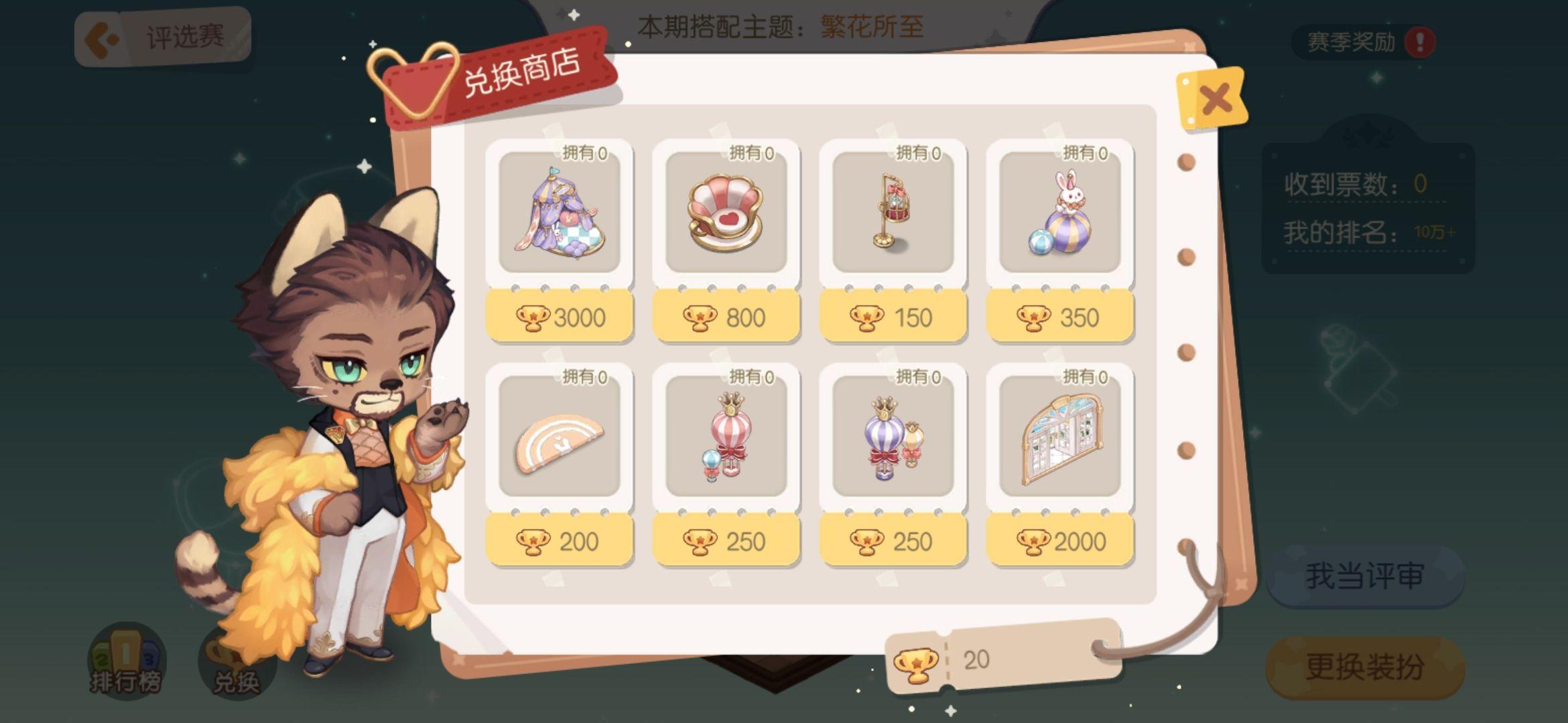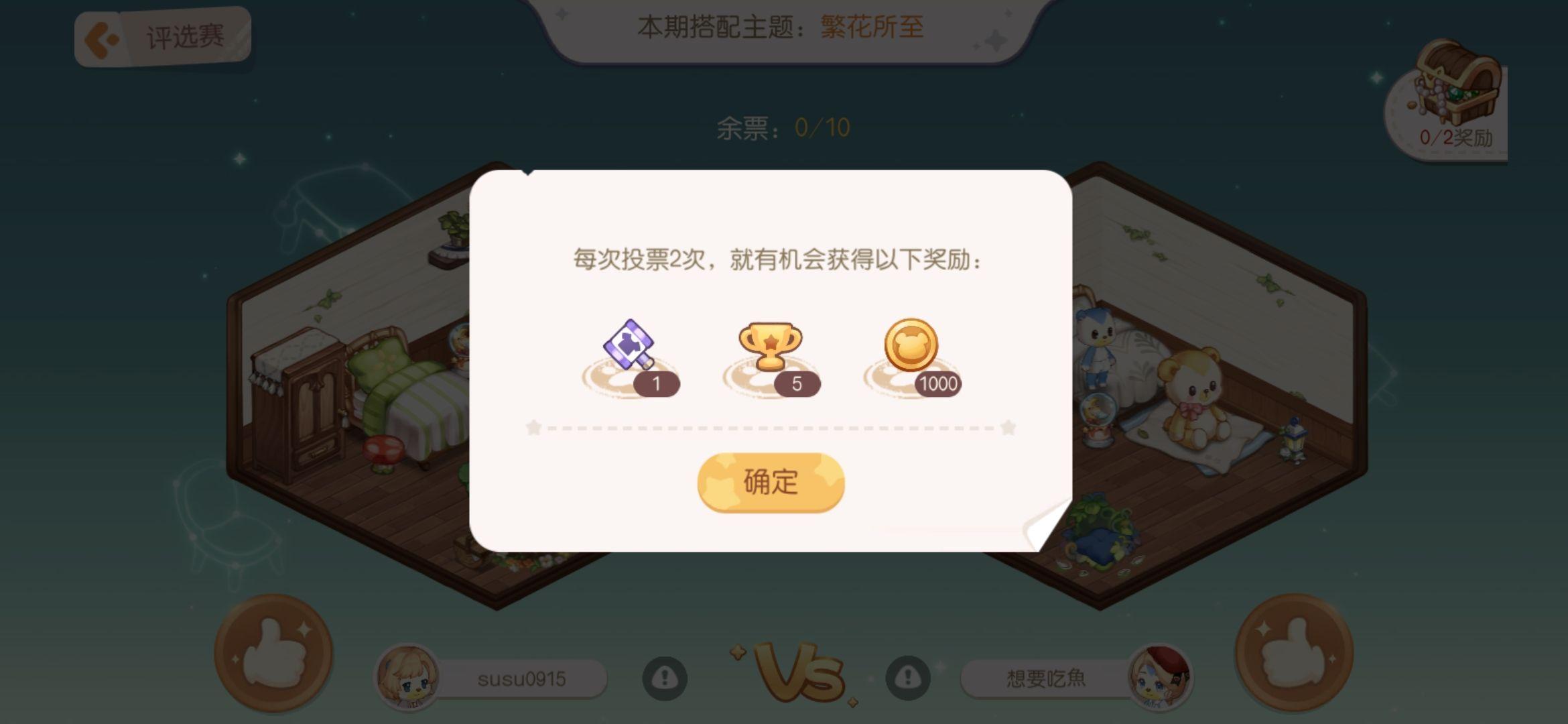 评选赛每天都要记得参与投票哦,一天10票能够获得五次宝箱,获得的点数还能够兑换家具和服拆,记得必然要拉满!