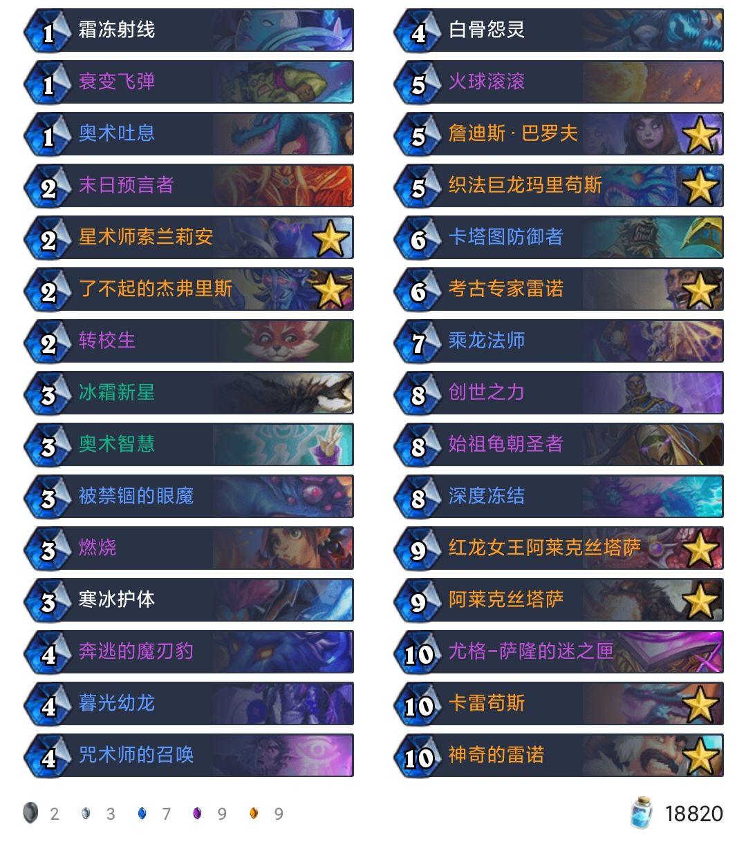 一套HSReplay上胜率59.3%,对局4700的宇宙法。几个版本下来,宇宙法在履历了大起大落落落之后,仍然在天梯里闯荡,不成谓不固执。得到了新版本的几张优良单卡的补强之后,又一次的呈现在了群众视野,固然热度远不及龟龟法和法强斩杀法,但是你要晓得法师的胜率不断都是靠宇宙法撑着的。