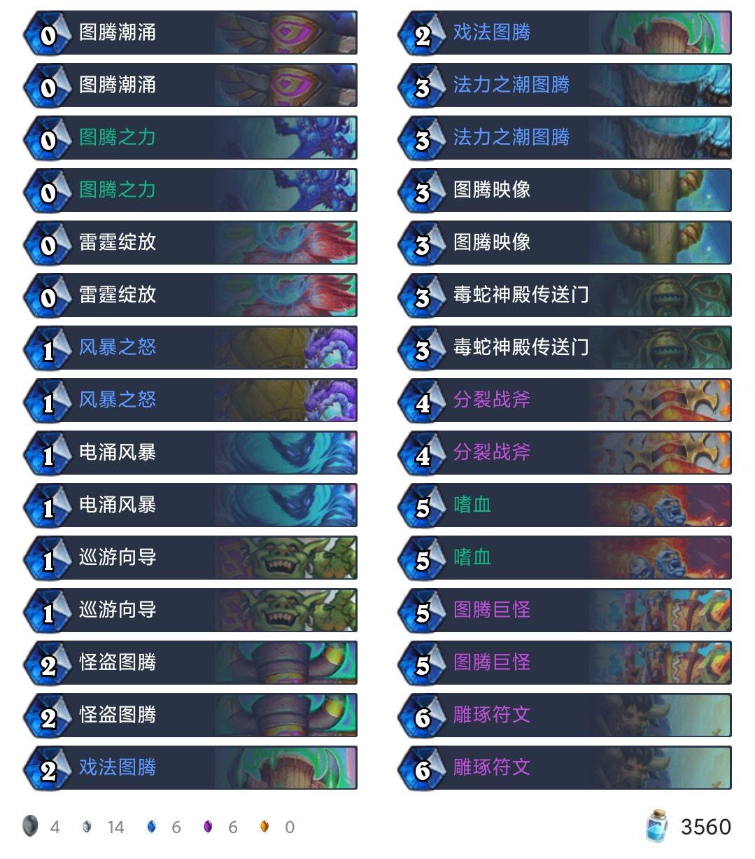 起手留牌:巡游领导,电涌风暴,怪盗图腾,戏法图腾,雷霆绽放,图腾映像。
