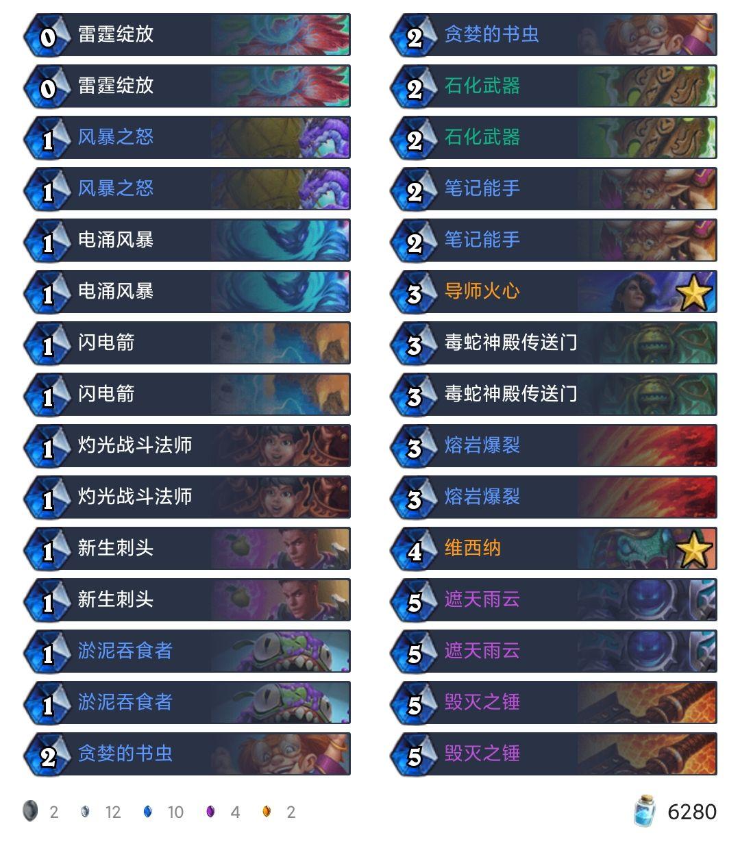 一套HSReplay上胜率54.3%,对局1900的打脸萨(被分类到法强萨)。打脸萨有两种思绪,一种是辅以法强系统的打脸萨,另一种就是纯过载的打脸萨,后者的胜率更高一些。那套牌通过电涌风暴等一费生物共同雷霆绽放+风暴之怒在前期打出一波超展开,中期通过书虫过牌稳固排场,最初有扑灭之锤+石化兵器,熔岩爆裂+遮天雨云的超高斩杀,导师火心也是一张能缔造奇观的牌。