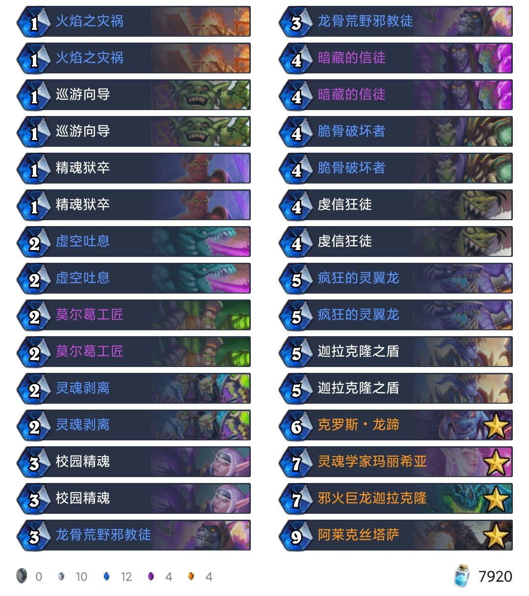 起手留牌:迦拉克隆的信徒,龙族研习,苦修,龙喉哨兵,永久吐息。可替代单卡:裂心者伊露希亚,思维窃取,迦拉克隆之盾。