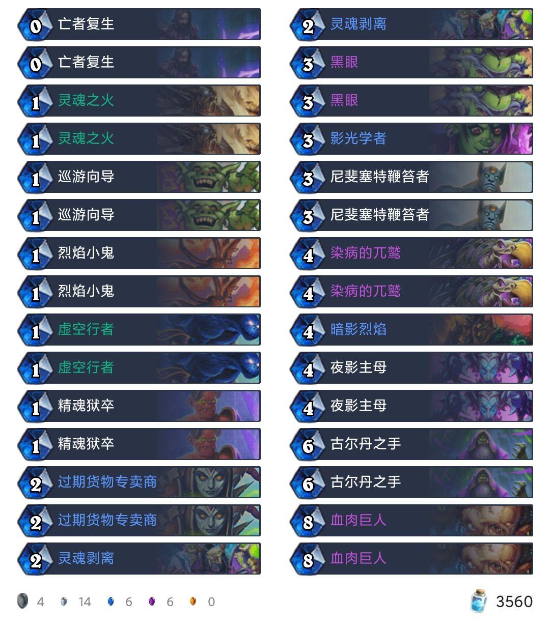 一套HSReplay上胜率58.6%,对局1900的祈求术。沿用了上个版本成熟的祈求术修建 ,完美契合了新的残片系统,增加解场才能的同时还供给了大量的回血才能。新卡脆骨毁坏者的表示十分惊人,因为祈求术自己就有良多的杂毛,以前处置大怪只能依赖灾害,如今靠脆骨毁坏者不只能完美解掉大哥还能保住原有排场持续施压。一边祈求一边洗碎片双管齐下,过牌铺场两不误,如许一套把异灵术都留在尺度的卡组,你确定不试一试?