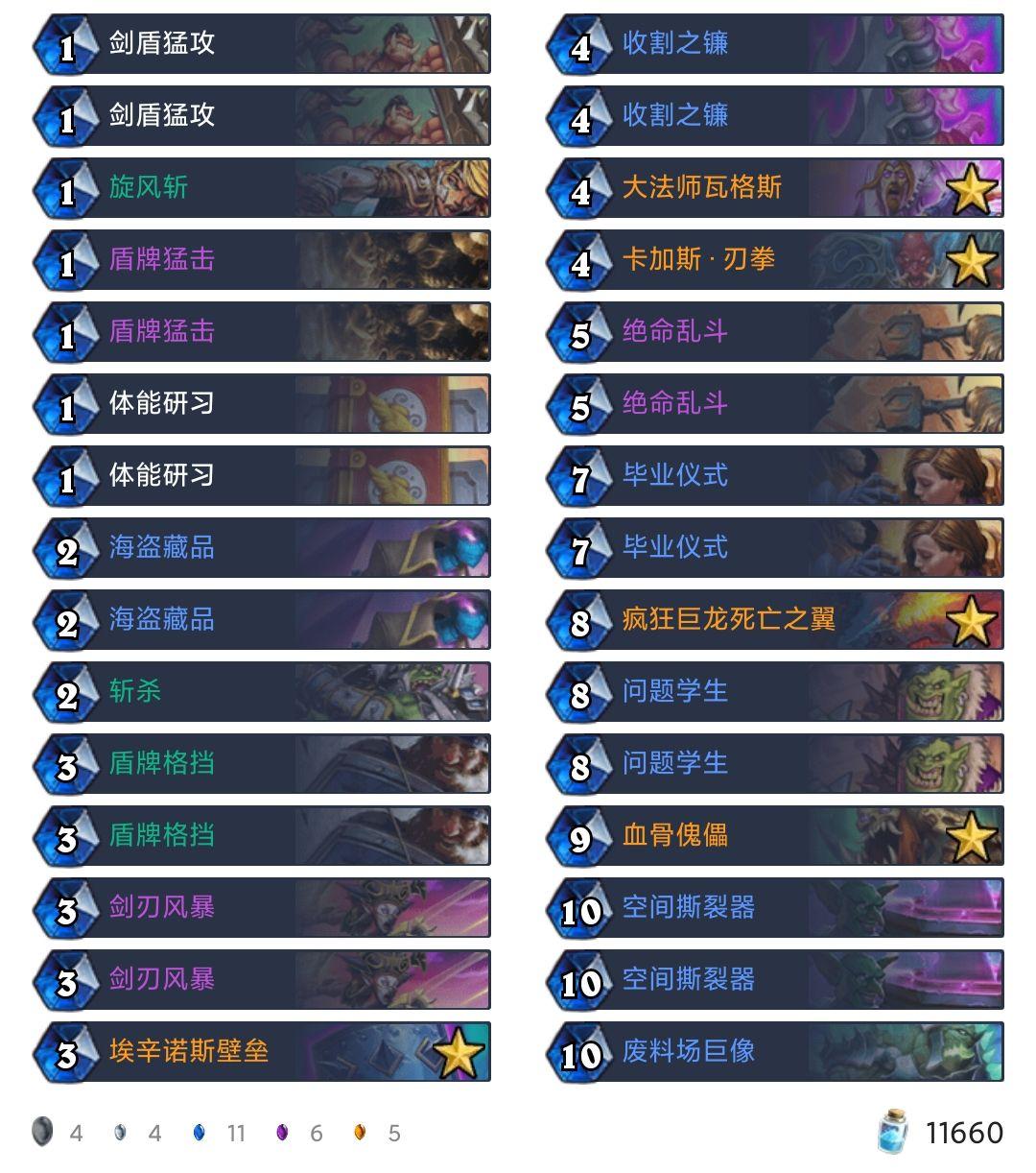 起手留牌:体能研习,剑盾猛攻,海盗藏品,剑刃风暴,卡加斯·刃拳,结业仪式。