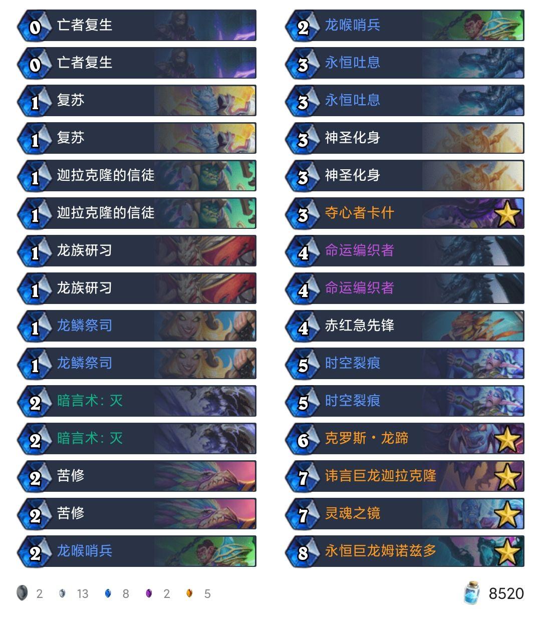 一套HSReplay上胜率52.5%,对局2900的祈求龙牧。因为那个版本对龙系统有所补强,所以一些人测验考试将龙系统融入到本来的祈求牧修建傍边。没想到的是那个测验考试十分胜利,两个别系很搭,龙族研习和亡者复活把祈求牧前期空过的问题完美处理,使得整套牌异常顺滑。值得一提的就是龙鳞祭司那张牌发现的神通是间接从牌库抽出来,并不是复造,希望各人玩的时候别忘了。