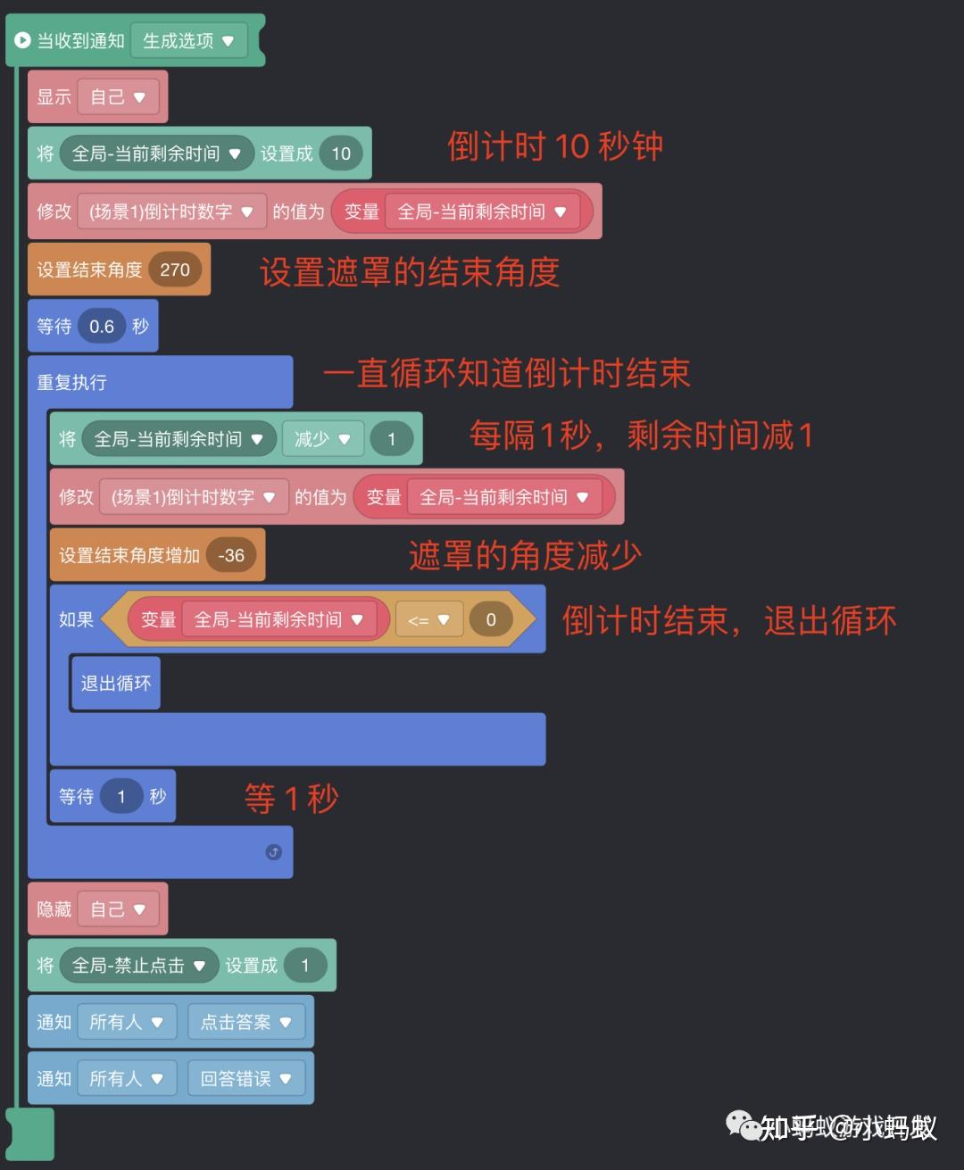 那里我们只需要存眷一个最核心的积木块,当点击选项时,比力部分变量“当前选项”中保留的列号,与准确谜底的列号能否不异,不异的话则答复准确,差别的话则答复错误。