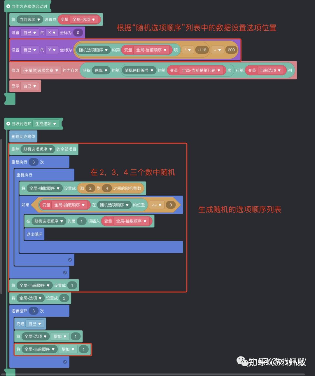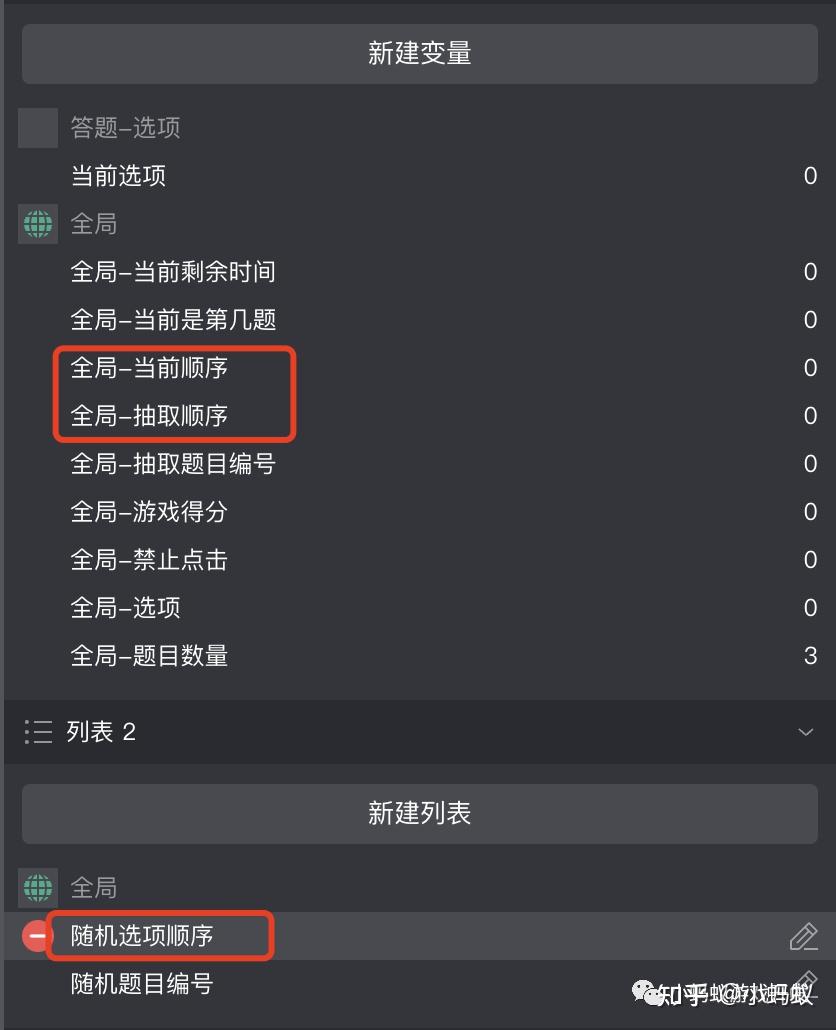 “随机选项挨次”列表用于存储随机的 2,3,4四个数字的随机组合,“全局-抽取挨次”变量用于帮忙创建列表,“全局-当前挨次”用于设置选项的位置。