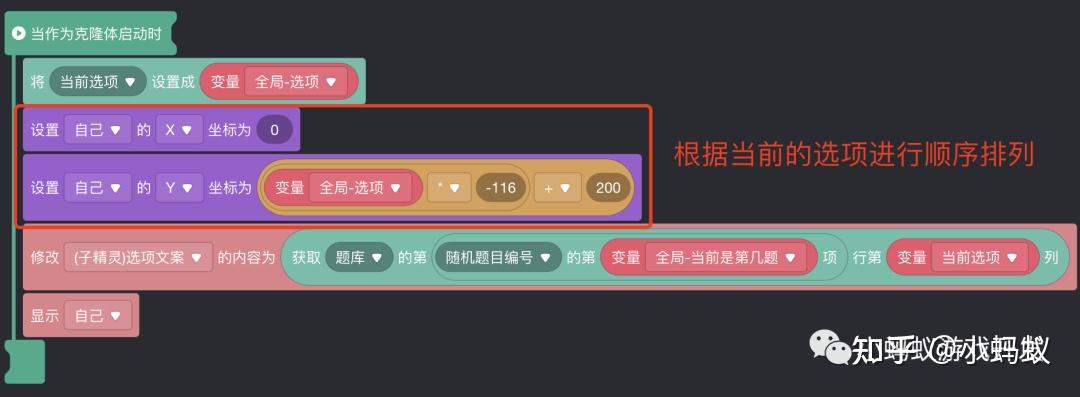 一个部分变量“当前选项”,用于存储当前选项在“题库”表格中的列号,全局变量“全局-选项”则用于在克隆体创建时设置其“当前选项”。
