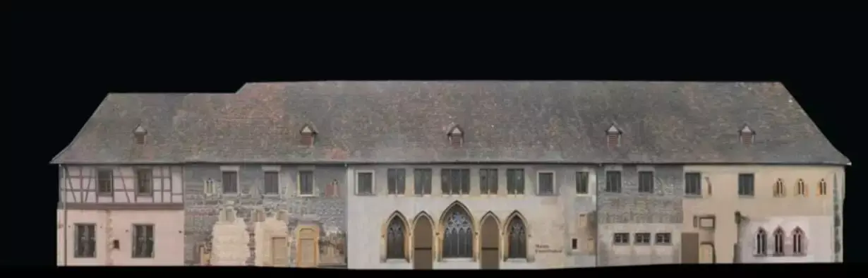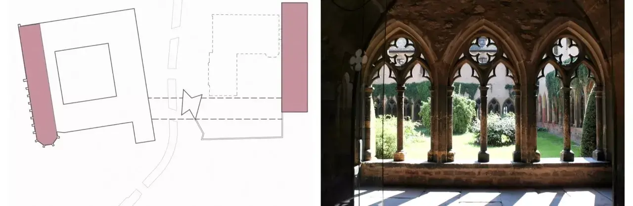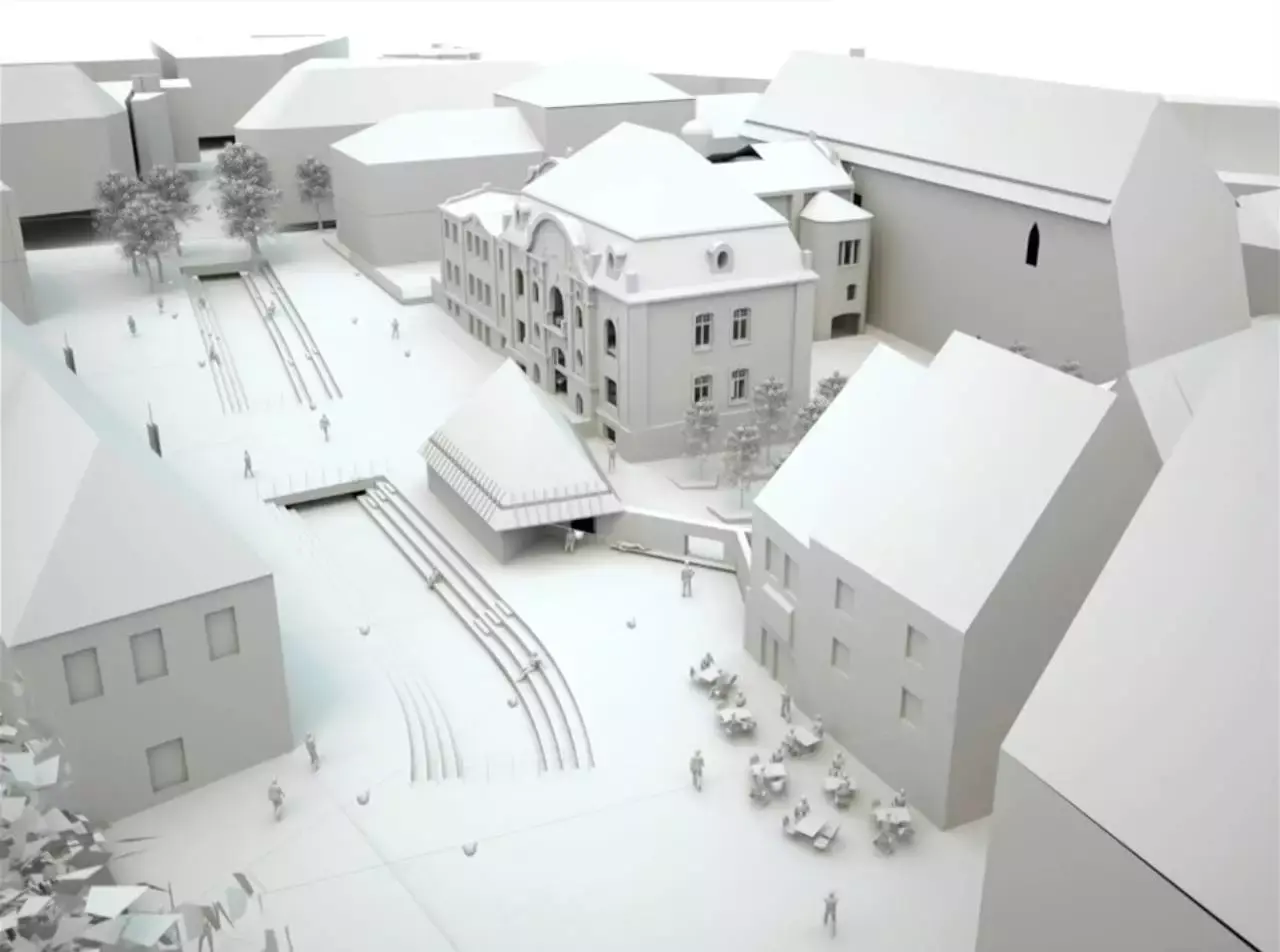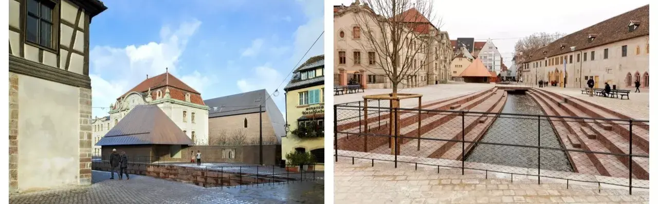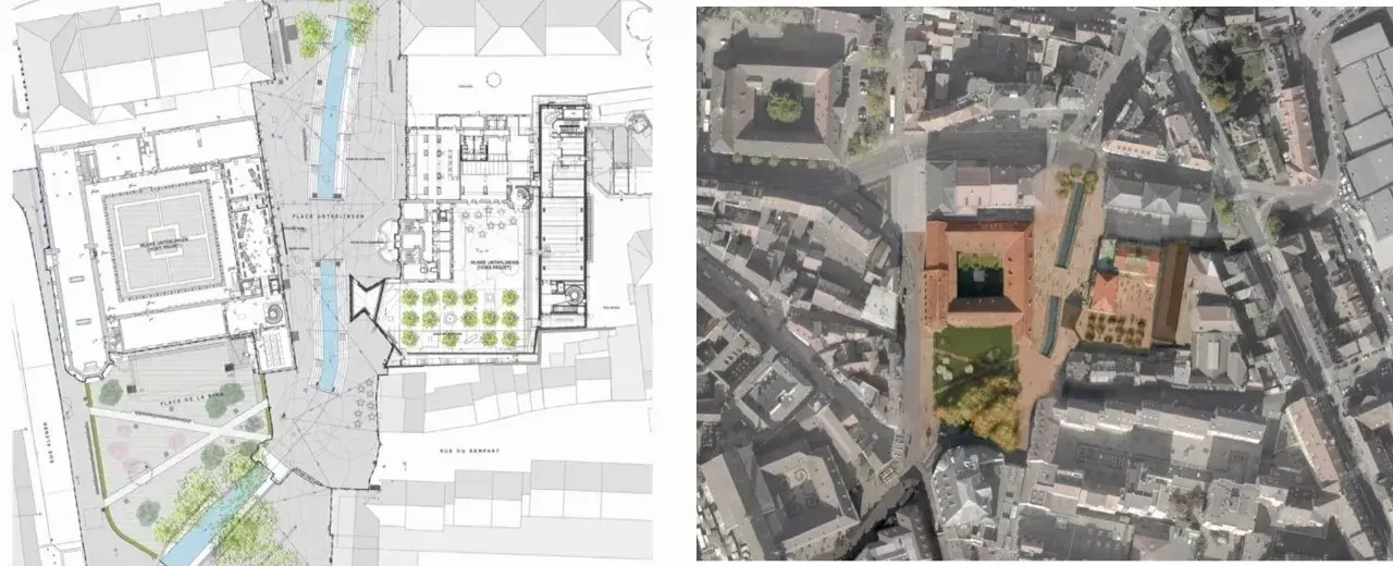 修道院革新前后比照照片革新之后两个建筑体量通过地下美术馆相连,在恩特林登广场两头对望。中世纪的修道院包罗了教堂、聚落、喷泉和位于边上的花园。广场的另一边的新博物馆和教堂体量相等,并与曾经的浴室一同围合了另一座封锁天井。