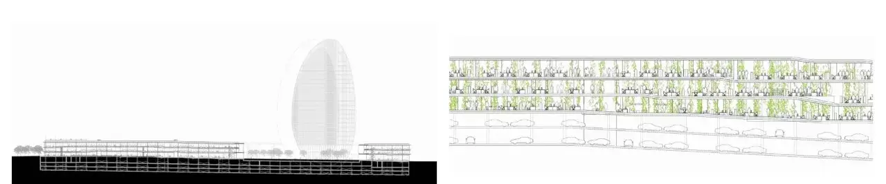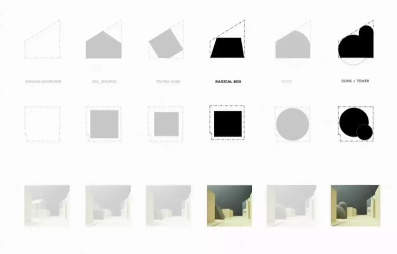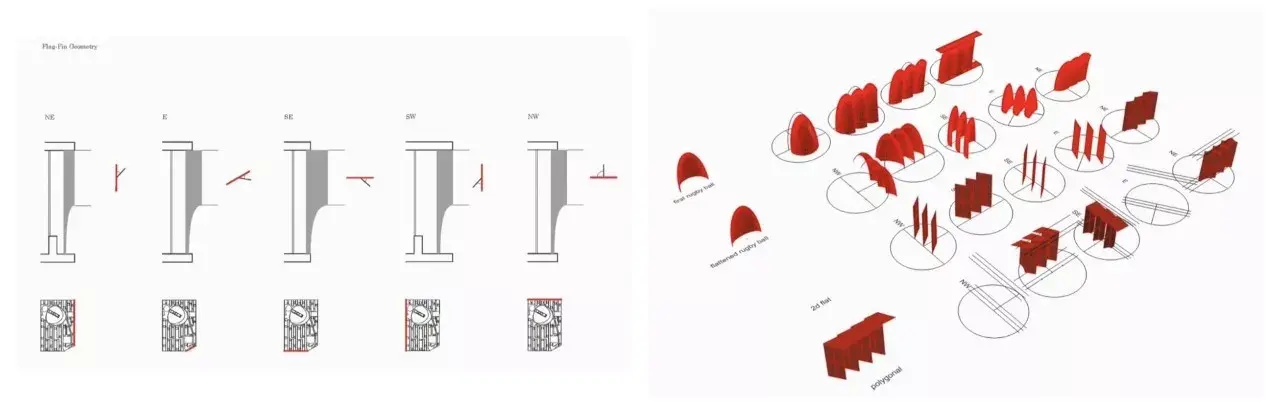 塔楼与圆形广场建筑是开放的,在内部营造的社区生态情况下,建筑原来其实不需要表皮的。考虑到基地太阳辐射严峻需要遮阳,我按照建筑的各个朝向的差别情况设想了差别尺寸和角度的遮阳板。