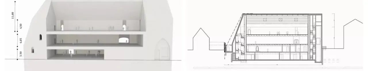 修道院革新前后比照教堂的屋顶也颠末了革新,我把新的板屋顶设在中殿上。参不雅者能够通过新的混凝土螺旋楼梯进入地下的毗连新旧建筑的画廊。我们精心设想了地下画廊和新展览建筑的室内空间,将展现19到20世纪的艺术做品以及现代笼统艺术,而二楼空间合适临时展览。它的山墙屋顶和11.5米层高照应了对面的多米尼加教堂。畴前浴室内被称为 "La Piscine” 的泳池连入新展览空间。浴室内的其他空间包容了博物馆行政、藏书楼和朝向新天井的咖啡馆,以及面向广场的科尔马旅游部分。