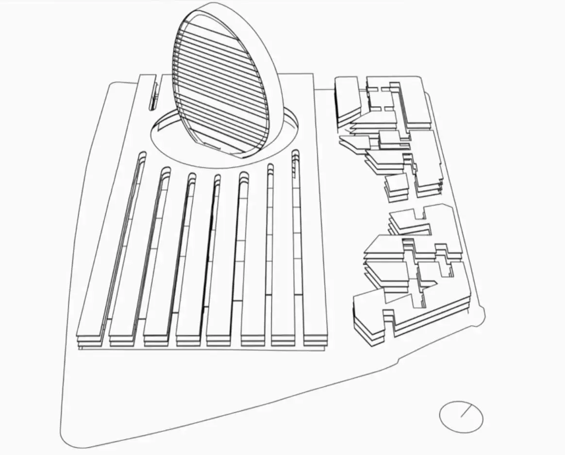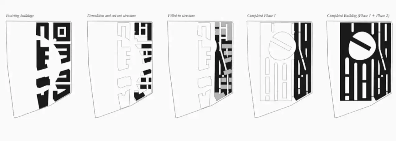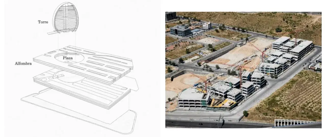 BBVA银行总部位于马德里北面的新城开发区域,所有街区建造与中国到处可见的新城一样,每个建筑都像孤岛。我在做BBVA项目之前,已有部门建筑正在施工。业主希望我能保留现有建筑,并在现有建筑西侧新建BBVA未来的办公总部。设想前我受戴克里先宫的启发,思虑建筑的灵性和潜力,一旦银行不再在那里办公或未来功用发作改动,那个新建筑同样也能为广阔S民办事,成为城S生活的节点,像戴克里先宫的开展过程一样。