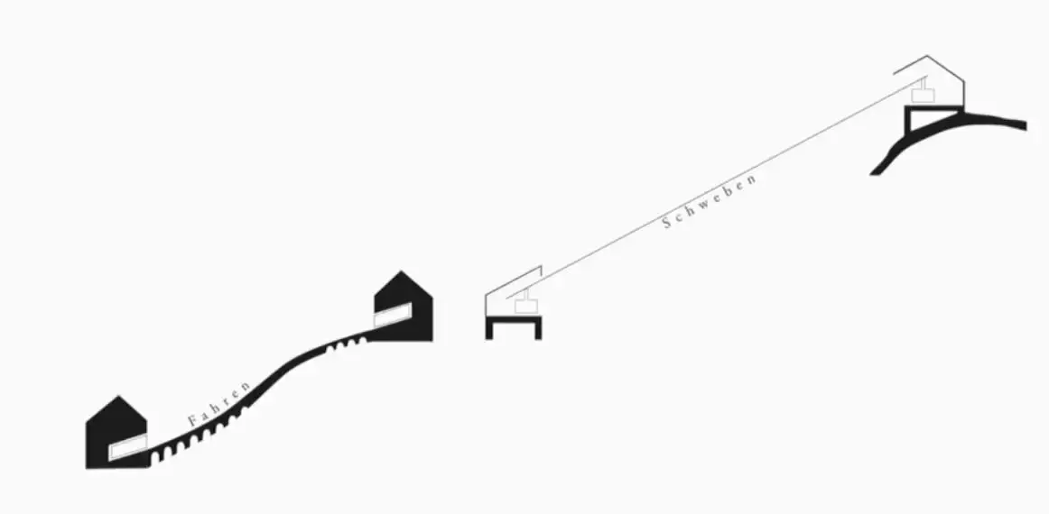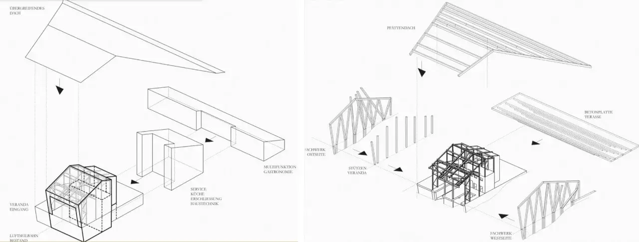 轴侧构成自从缆车投入利用后,本来供建筑工人住宿的房子就被临时革新成餐厅。而如今那座房子已经被拆掉,为做新的餐厅腾出空间。同时,本来混凝土根底钢构造的缆车站也换上了新的表皮。新的餐厅位于缆车站的上方,其形态适应地势向南延伸。庞大的屋顶则将两个部门毗连在一路,并构成了一个室外的欢送大厅。