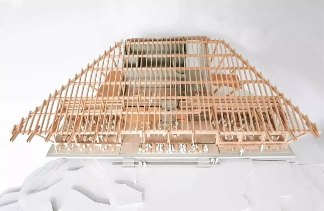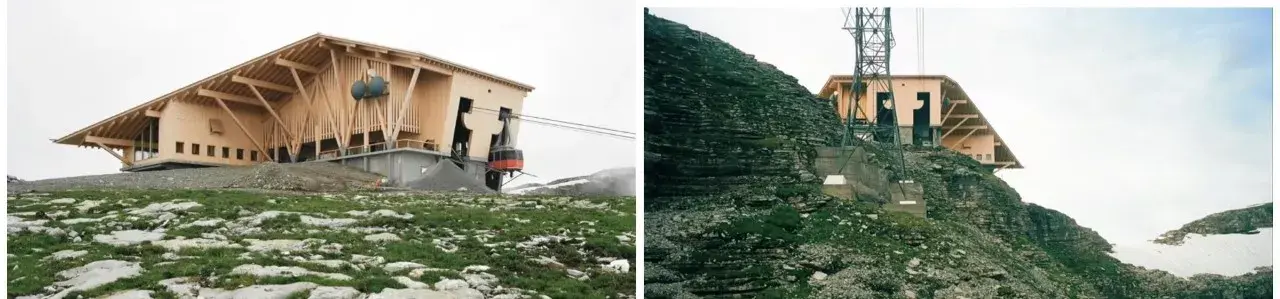 新缆车站照片所以我们决定拆除原村庄,将所有功用整合同一(incorporate),成为图中的那一处场合。我想在缆索列车抵达的道路上缔造特殊欣喜,去掉多余的功用,缔造一把通往出人意料的别有洞天空间的钥匙。那就是我们操做的体例,有三个根本元素:缆车起点,然后是大屋顶和办事区,最初是餐厅酒吧。同时我们还要重做整个建筑的手艺部门。