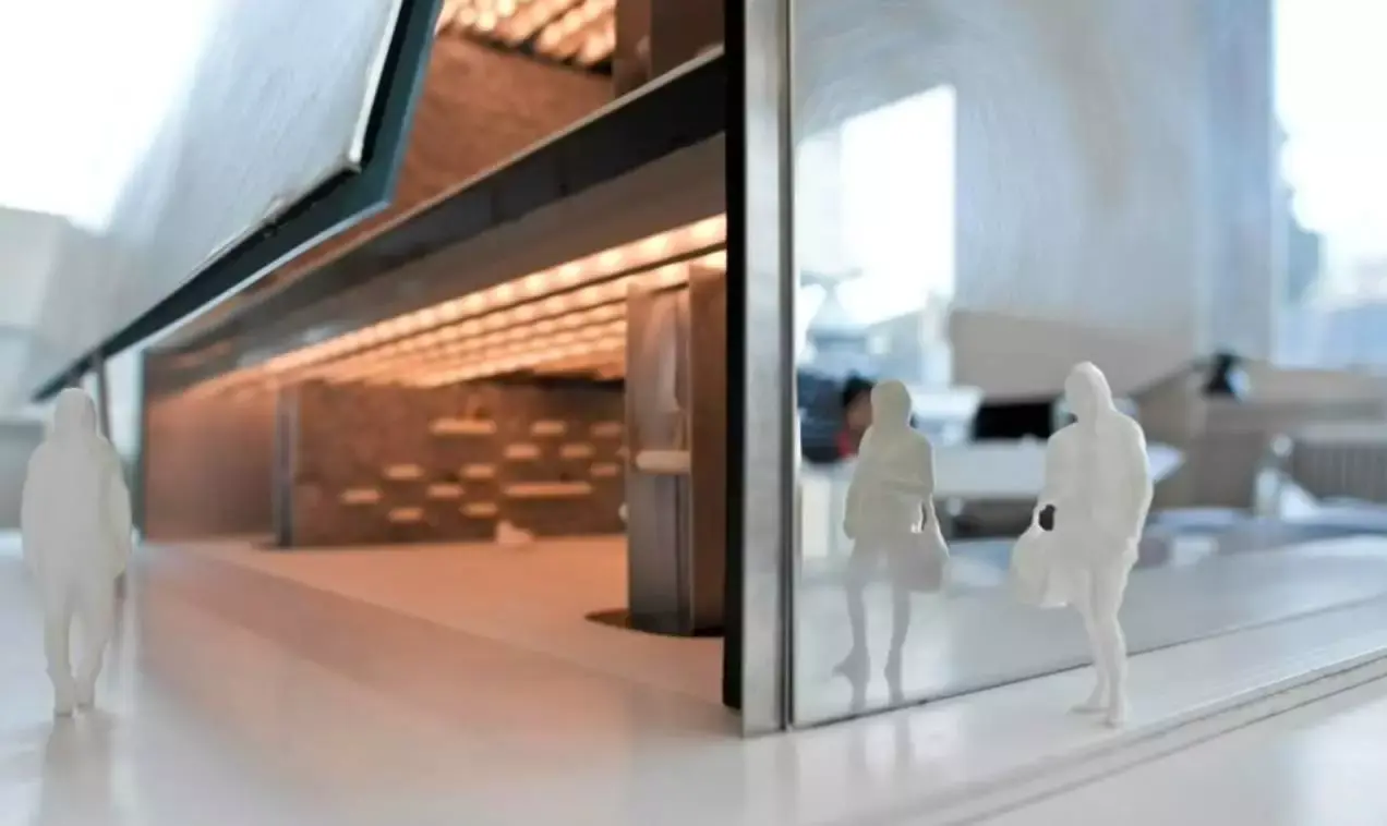 洽商间透视场景图建筑构造在夜晚愈加耀眼,那些凹凸的玻璃砖吸引着人们的留意力,那些20世纪初就流行的凹形玻璃使橱窗里的商品栩栩如生,似乎没有任何阻隔。那些凹凸弯曲的玻璃外表在人眼中变革万千,当你站在建筑外感应内部空间若隐若现,欲拒还迎,那就是表里的视线互动产生的感官体验。
