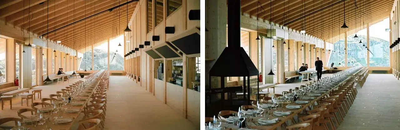 重建的构造只用硬木质料,所以我面对的挑战就是要寻求简洁有力的悬挑构造(cantilever),必需能抵御高处强风荷载。所以那些构造同时又像雕塑做品,空间形式同时既是构造又是粉饰。同样,灯具家具等都是我要表达的建筑语言的一部门。我还在站台中间安插了酒店,所有的根底设备和户外功用均可在白日供人们利用,能够开聚会。餐厅被塑形成长条形的灵敏空间,云杉木粉饰营造了整体温暖气氛。低矮的屋顶下慎密摆列的木梁成为了整个建筑的次要元素。
