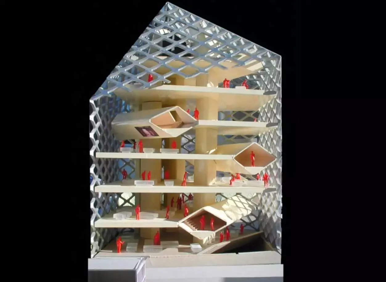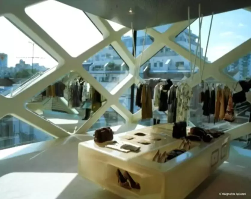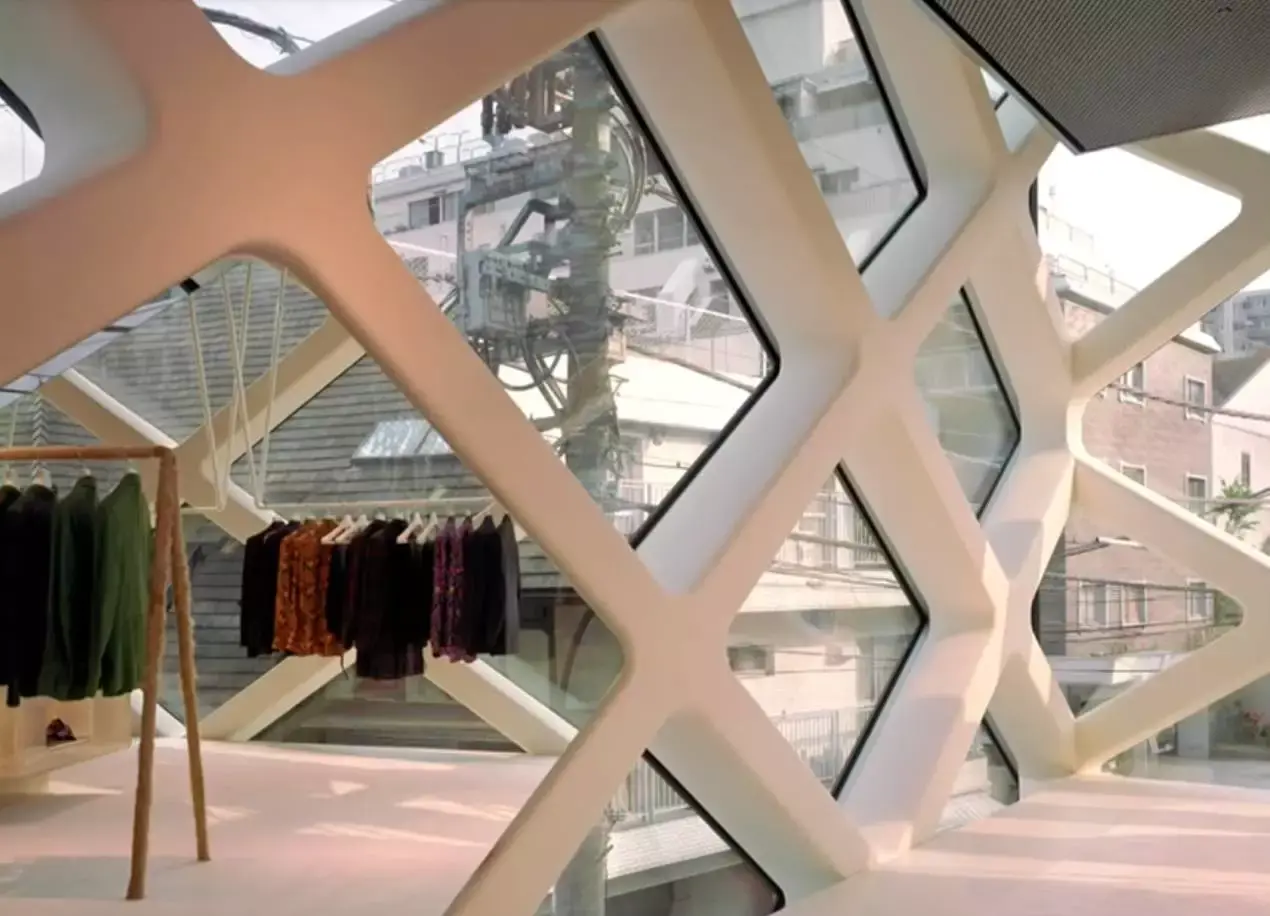 表皮是建筑外墙和屋顶连系的斜肋构造构架,同时用于收承各层楼板。建筑内部垂曲的核心筒和从外墙格子程度拉伸而成的菱形管毗连楼板,也加强了外壳构造的不变性。零售空间则是在各类构造构件中自在活动,程度拉伸的菱形构造管同时又成了小标准的试衣室空间。