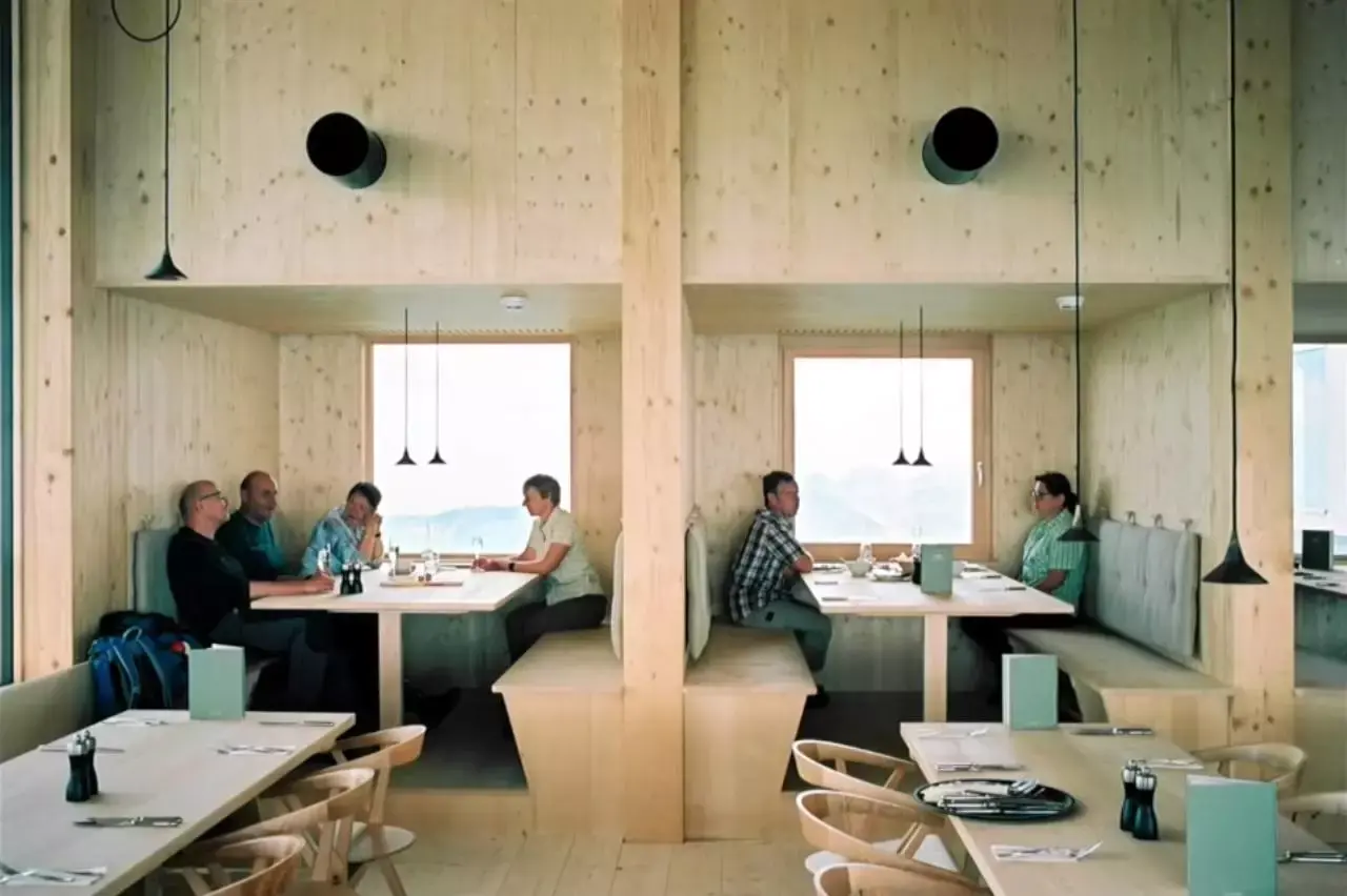 室内空间照片因为餐厅三面为大面积玻璃窗,旅客能够尽情享受山顶壮丽的风光。剩下的一面我们设想了凹进的小隔间,每个隔间配有供歇息就餐的桌椅且开有小窗,供给给旅客奇特的山地景不雅,用餐体验很好。但当你将门关起来那就成了可供睡觉的封锁空间,类似在火车卧铺或胶囊旅店。所以我们设想了亲密交换的空间,与四周开敞的大场地产生比照,所以那里也吸引了当地人前来体验。