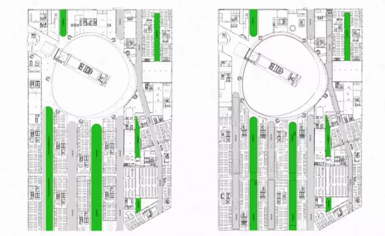 BBVA项目之前场地照片竞赛时,我接纳的地毯加指状的空间战略获得了业主和评委们的喜爱。现有建筑并没有很好地与新建筑连系在一路。概念上,地毯一部门空间被剪切后间接树立成为塔楼。剪切后的负空间成为绿色广场,与马德里斗牛场有一种空间上的照应,是西班牙城S公共空间原型的再现。