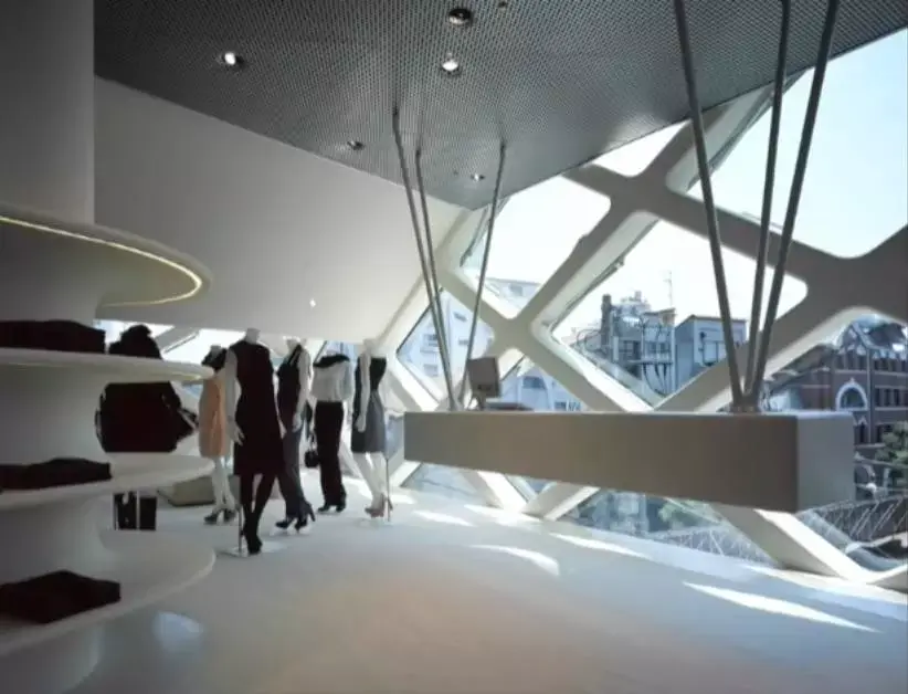 那些封锁构造腔体的管状空间(structural tubes)能够做为更衣室或试衣间,还能够做更私密(intimate)的洽商间或会议室利用。从照片能够看出那些构件正如立面构造一样极其安稳,且在粉饰(fitting out)中不竭变革。在Prada旗舰店看到的设备你在Miu Miu旗舰店也能看到,因为它们属统一家公司,Miu Miu只是Miuccia Prada(缪西亚・普拉达)的昵称。那里所有的材量以及家具灯具等元素都是颠末设想的,和Miu Miu旗舰店一样。