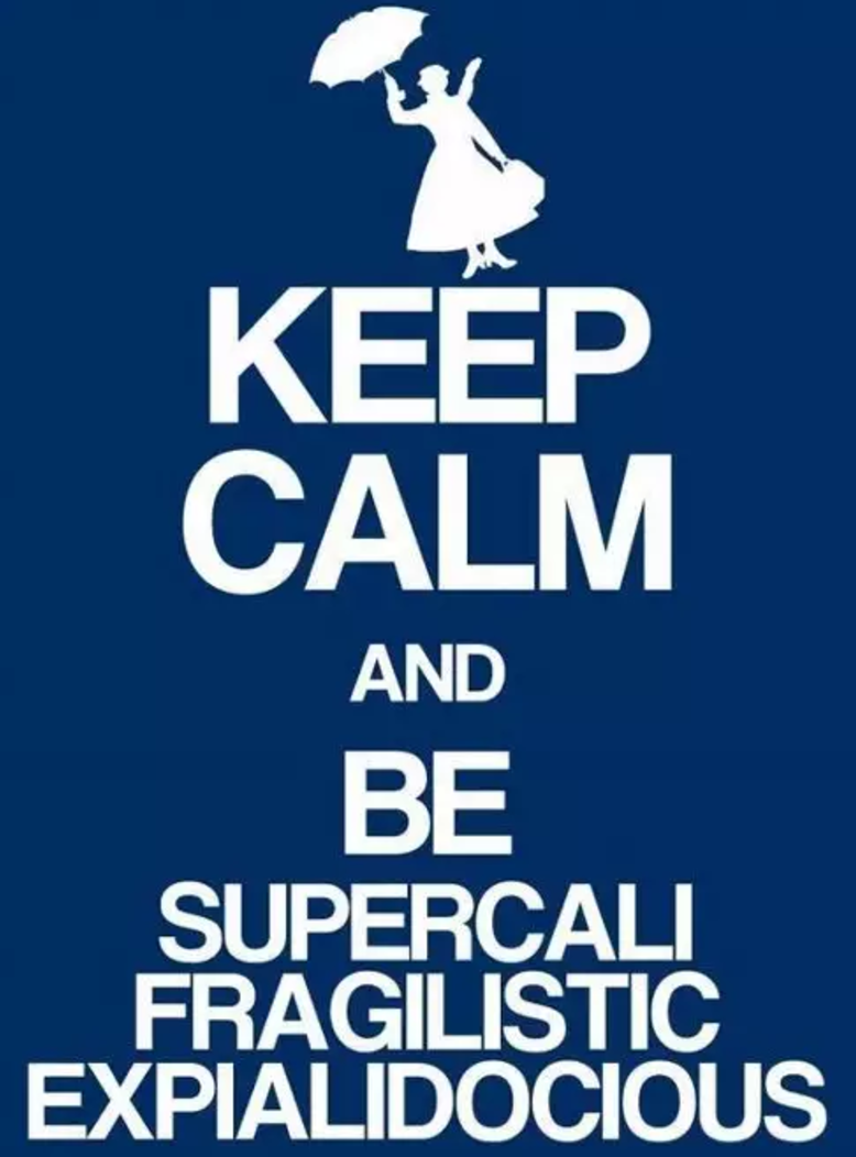 The roots of the word have been defined as follows: super- "above", cali- "beauty", fragilistic- "delicate", expiali- "to atone", and -docious "educable", with the sum of these parts signifying roughly "Atoning for educability through delicate beauty." According to the film, it is defined as "something to say when you have nothing to say”.看着挺复杂,其其实白话里就是”哎妈哇塞我勒个去乖乖隆地咚”之意。暗示十分赞,极其棒,帅呆酷毙碉堡了。
