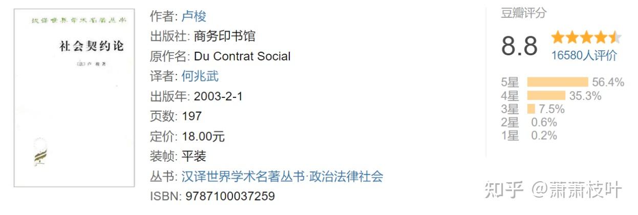 本书是十八世纪法国启蒙思惟家、法国大革命的思惟前驱卢梭(1712—1778)的一部政治哲学著做。它切磋的是政治权力的原理,它的大旨是为人民民主**的成立奠基理论根底。 本书分为四卷:第一卷阐述了社会构造和社会契约,第二卷论述**及其权力,第三卷论述政府及其运做形式,第四卷讨论几种社会组织。书中所倡导的民主理论很快风行世界,不只引发了震惊世界的法国大革命,亦为美国《独立宣言》、法国《人权宣言》等奠基了理论根底。本书第一次提出了“先天人权”和“**在民”的思惟,后者是现代民主轨制的基石。做者简介: