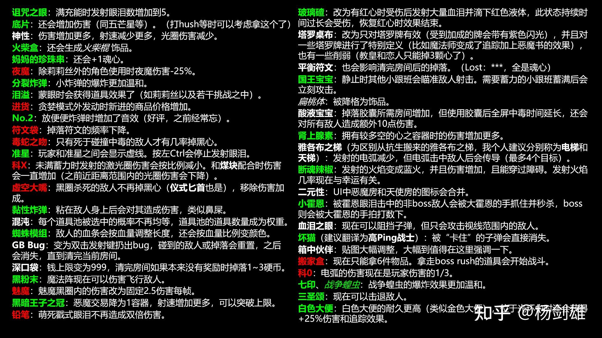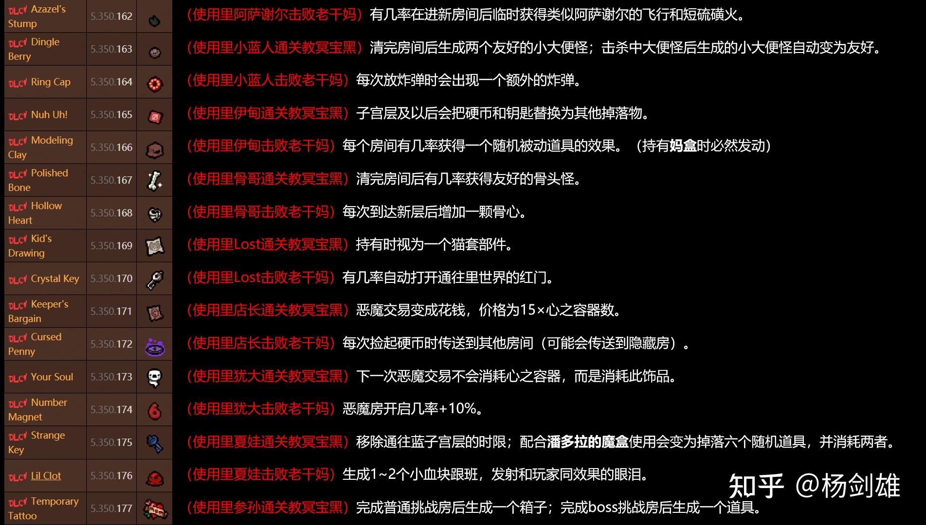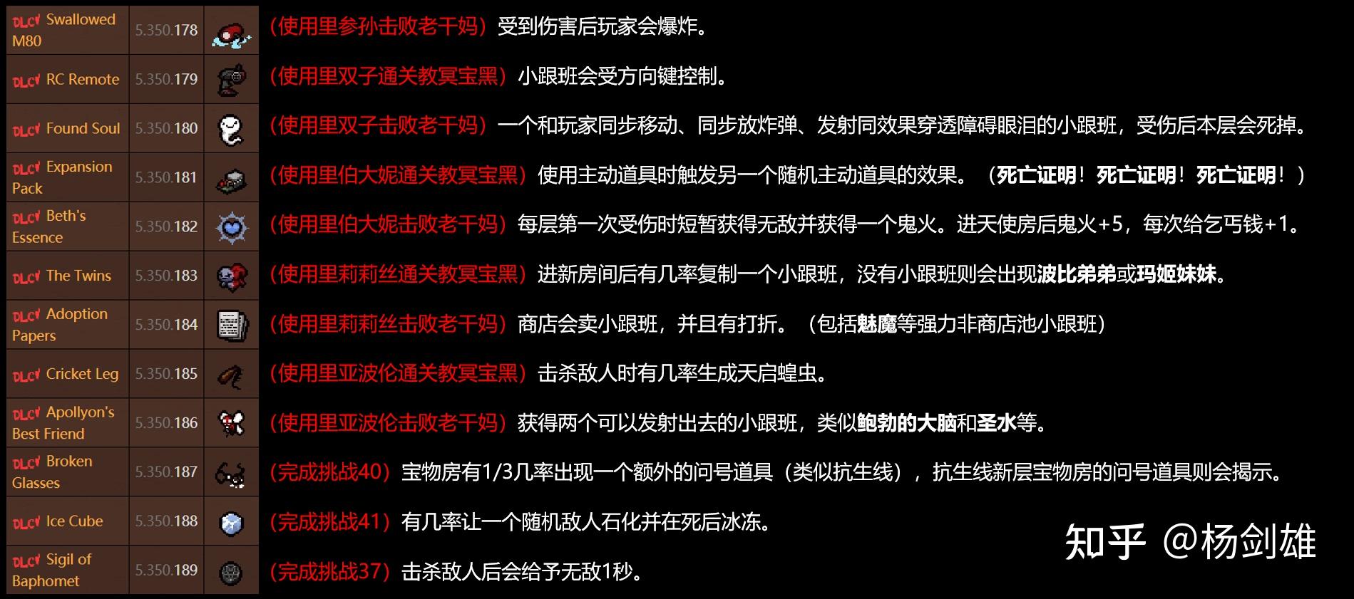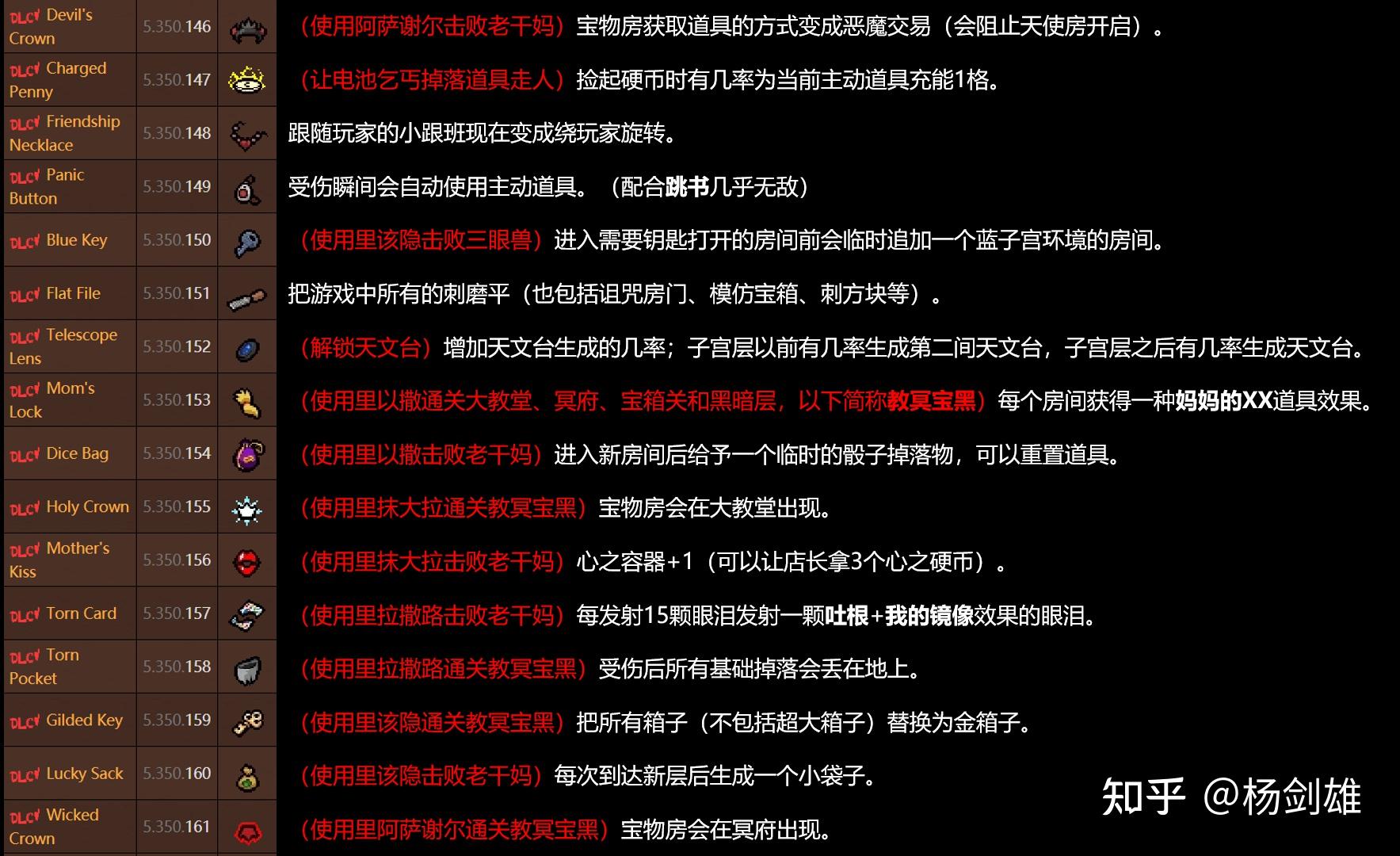 之后再说说忏悔中被改动的道具。有的道具是小改,有的道具几乎重做了,还有的道具小幅或大幅换了贴图。只换贴图的就不说了(各人拿了之后就晓得是啥了),换道具池的不说了(值得留意的是金箱子的道具池大动,根本都只是boss房道具了),新增的套拆部件不说了(纳威精灵:不是我怎么就成了苍蝇了??),新增的道具共同也不说了(好比硫磺火+寄生虫,阿萨谢尔狂喜),那里只说被改动的道具,按被动主动和ID挨次。得到强化的标识表记标帜为绿色,被削弱的标识表记标帜为红色,重做或者有强化有削弱的不做标识表记标帜。很可能不全,欢送各人积极弥补。