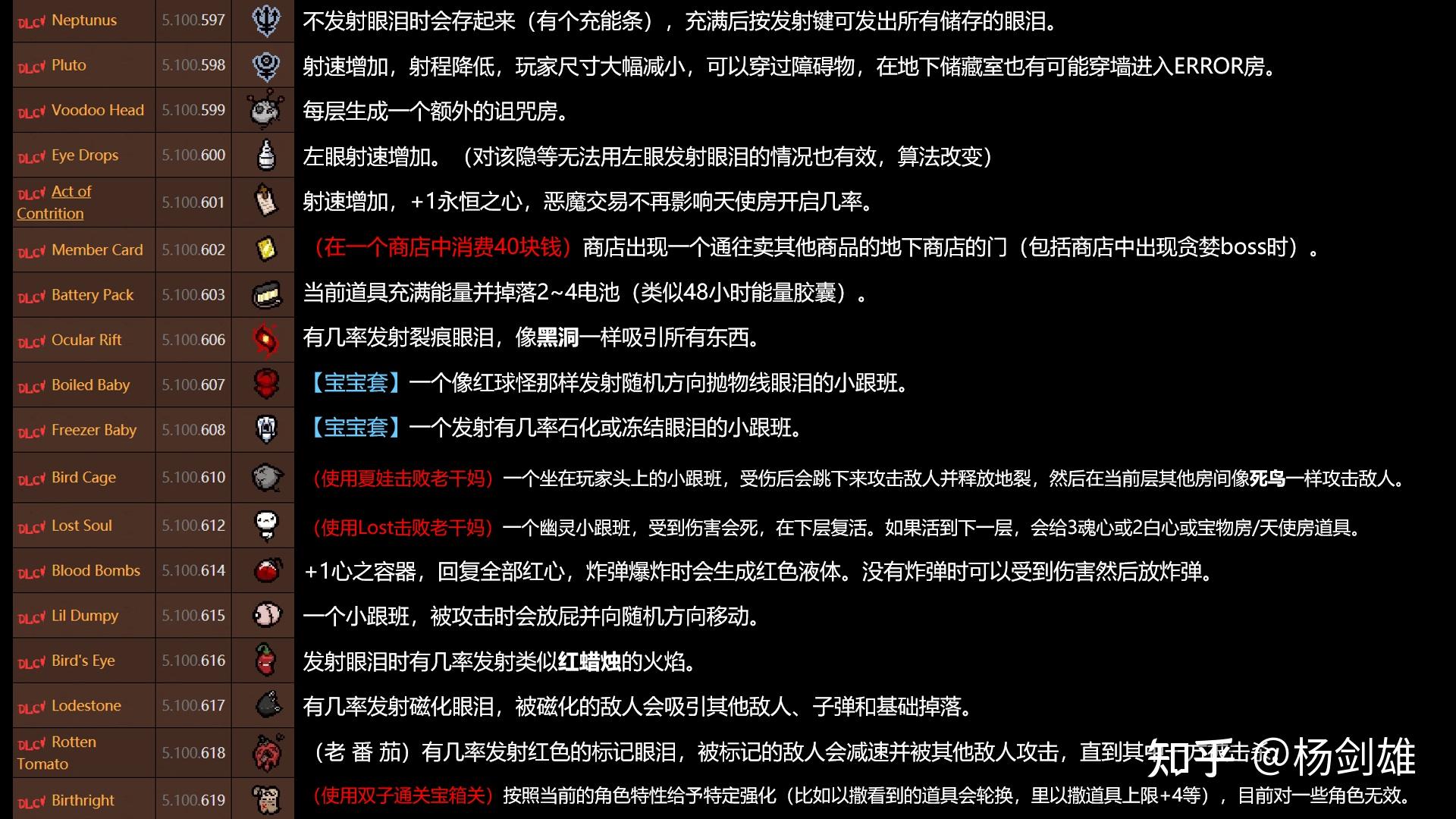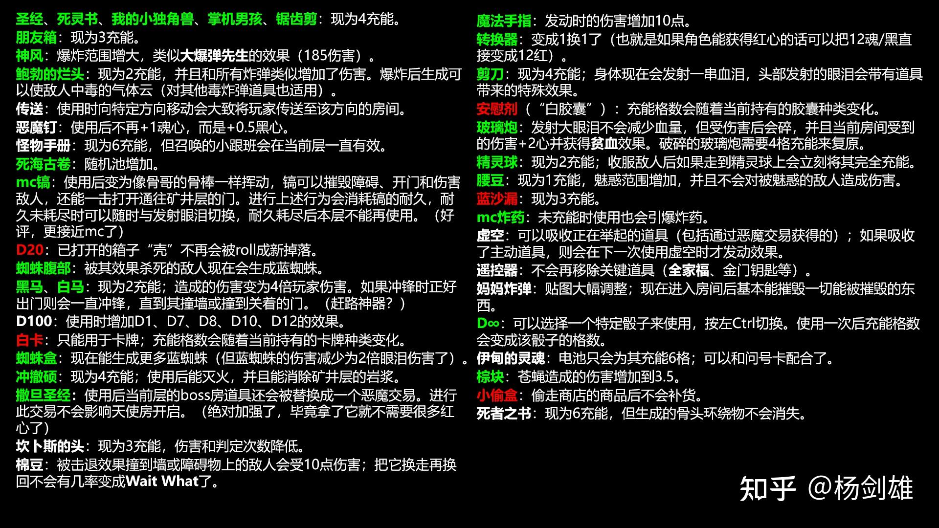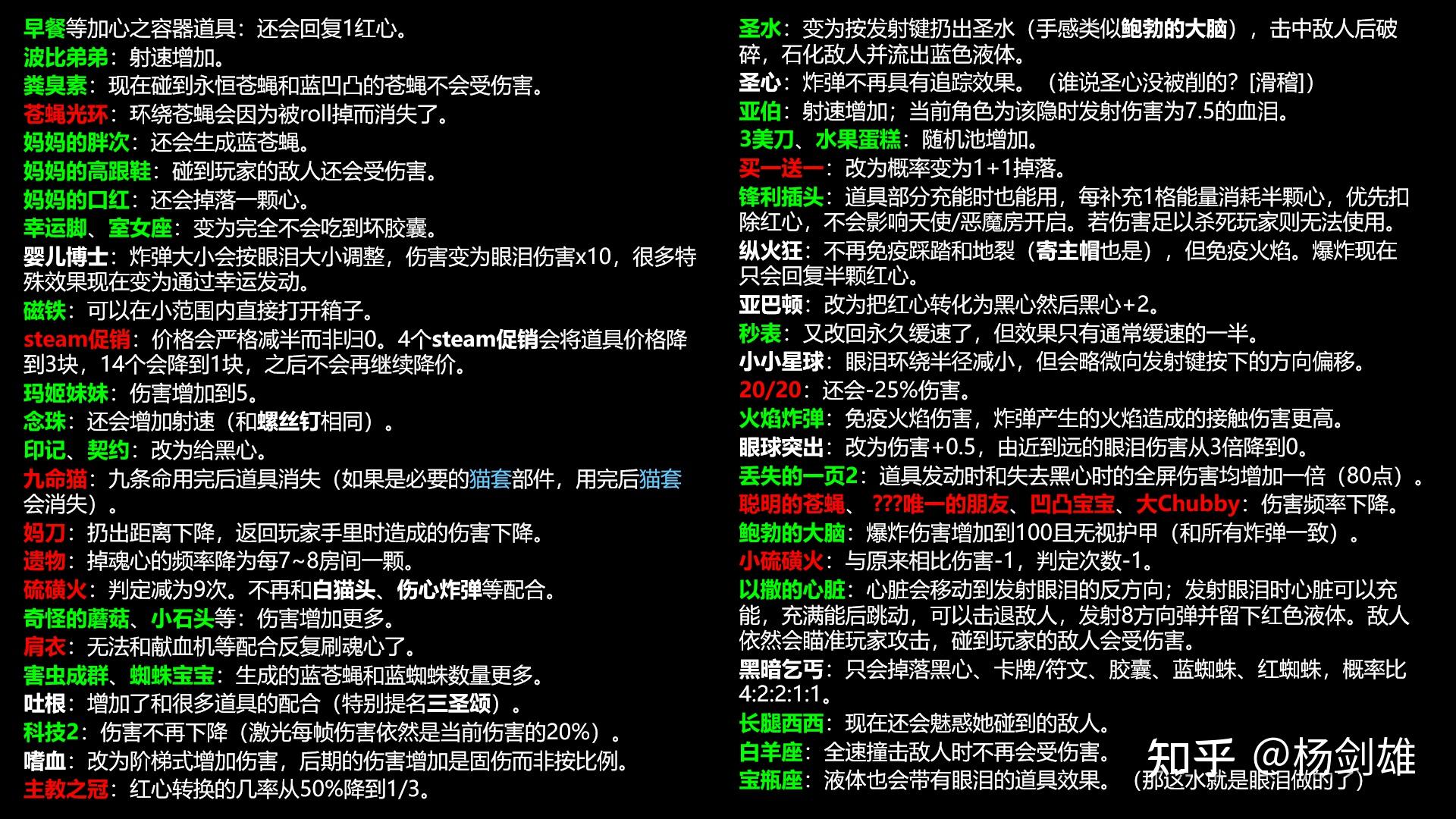 之后再说说忏悔中被改动的道具。有的道具是小改,有的道具几乎重做了,还有的道具小幅或大幅换了贴图。只换贴图的就不说了(各人拿了之后就晓得是啥了),换道具池的不说了(值得留意的是金箱子的道具池大动,根本都只是boss房道具了),新增的套拆部件不说了(纳威精灵:不是我怎么就成了苍蝇了??),新增的道具共同也不说了(好比硫磺火+寄生虫,阿萨谢尔狂喜),那里只说被改动的道具,按被动主动和ID挨次。得到强化的标识表记标帜为绿色,被削弱的标识表记标帜为红色,重做或者有强化有削弱的不做标识表记标帜。很可能不全,欢送各人积极弥补。