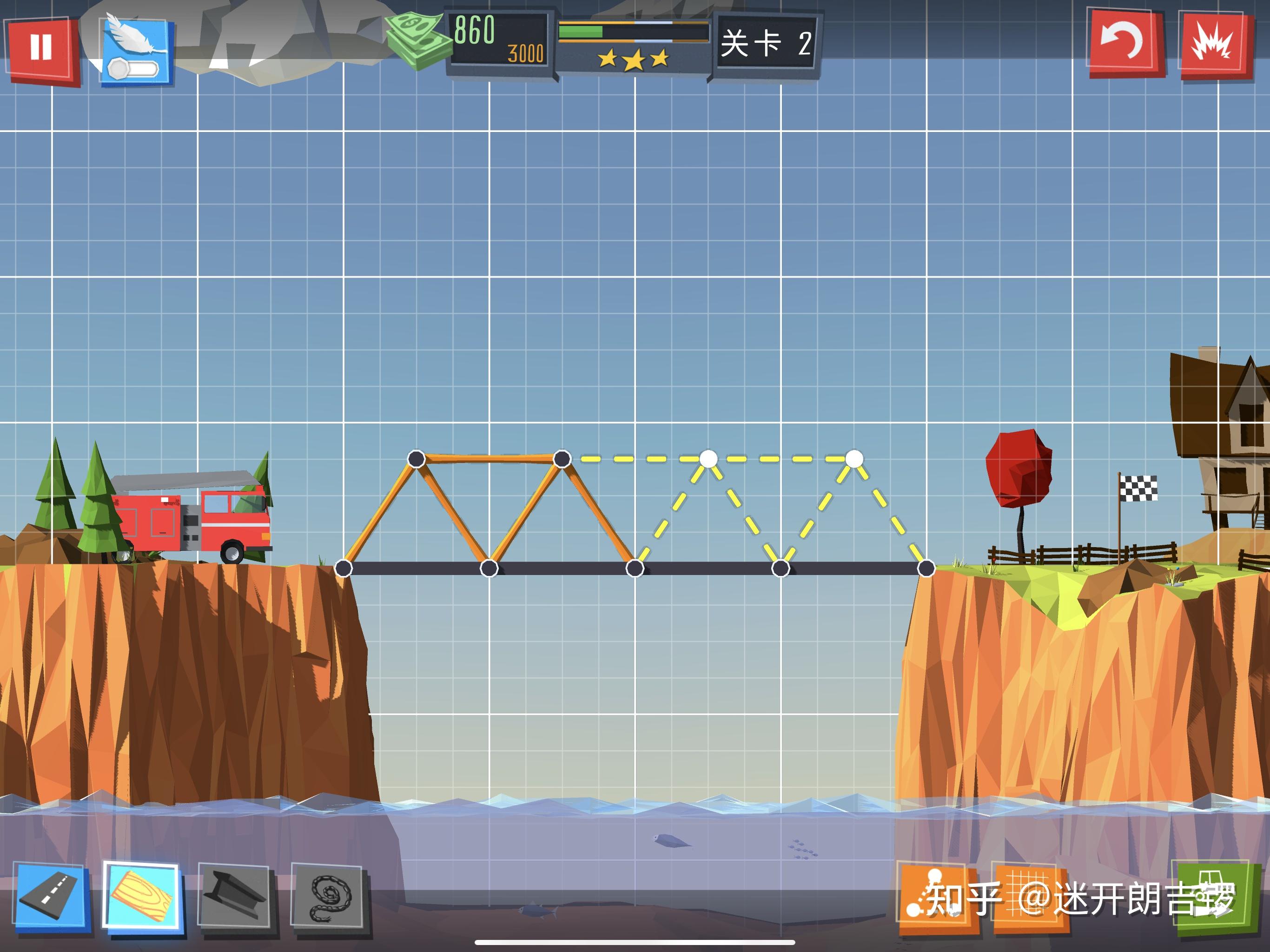 跟着关卡难度的增加,通过的车辆会越来越重,你的质料也会越来越丰硕,能造的桥的款式也越来越多——梁式桥、拱式桥、悬索桥、斜拉桥、刚构桥和组合系统桥……