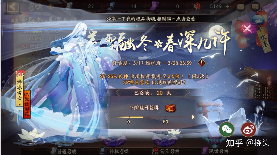 固然比来玩阴阳师不是很肝了,但仍是蛮欧的,SP雪女的活动登录了一下,20抽娶回家