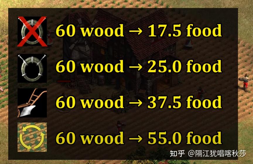 2)接着上一条谈一下食物与木头。游戏中木头的来源就是树木,一场游戏很少会实的呈现把所有木头都砍光的情况(除非你是把它当模仿城S玩,或者一些木头极其少的地图),所以理论上你能够把木头视为一种无限资本。而食物除了前期的猎物与草莓,中后期都是靠种地来弥补,农田的素质就是一个将少量木头迟缓地转化成大量食物的工具。所以根据游戏后期的经济学角度,食物的价值是低于木头的。