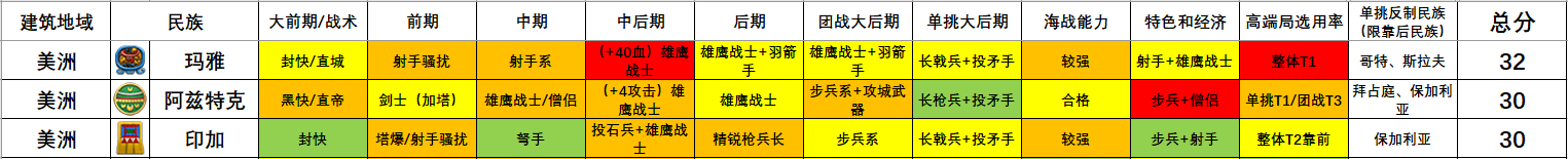 中后期 - 城堡时代后期到帝王时代初期:游侠等超强力军种还未呈现,所有民族遍及有必然或较强的战斗力,部门民族有极强战斗力,优势明显。(没有民族3分以下,拥有满级劲弩手或重拆骑士则4分,部门民族5分)