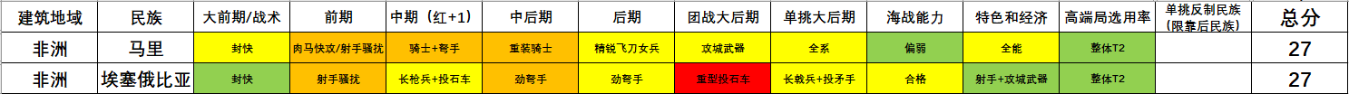 · 埃塞俄比亚:前期、大后期民族;同定位强势民族:【T1级】玛雅、【T2级】蒙古