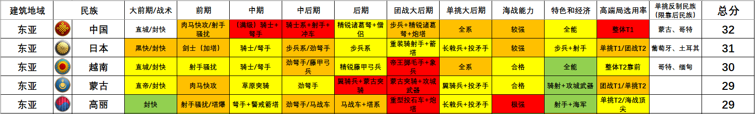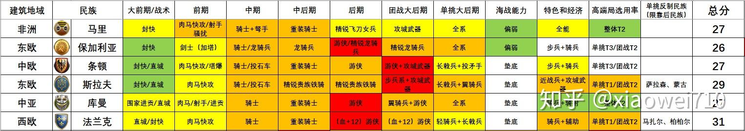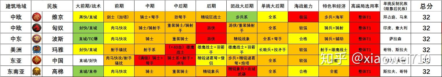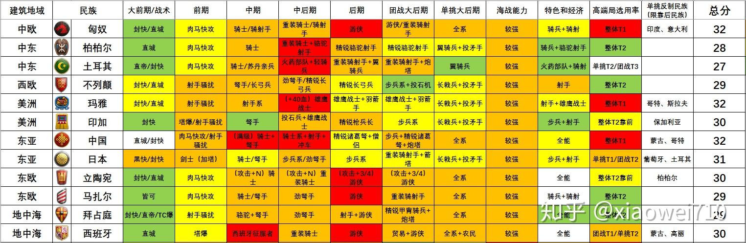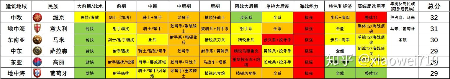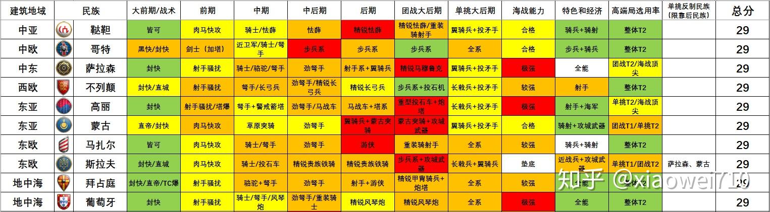 因而本指南就以时间(时代)视角为主,以军种和战术的强度来对各个民族停止系统的阐发和类比,以此为列位玩家们供给民族选择的参考。媒介(一)——表格设想按照