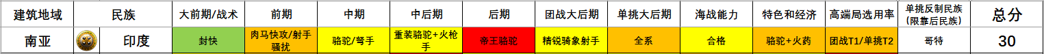 后期 - 帝王时代中后期:游侠等强力军种已经呈现,但商业线路还未成型,所有民族遍及有必然或较强的战斗力,游侠民族主宰战场,优势明显。(没有民族3分以下,有满级游侠的民族5分,部门其他民族因特殊军种有差别分数)